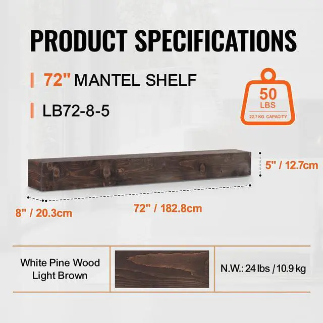 • VEVOR Fireplace Mantel Wood Shelf Floating Rustic Mantel Shelf 72" Light Brown