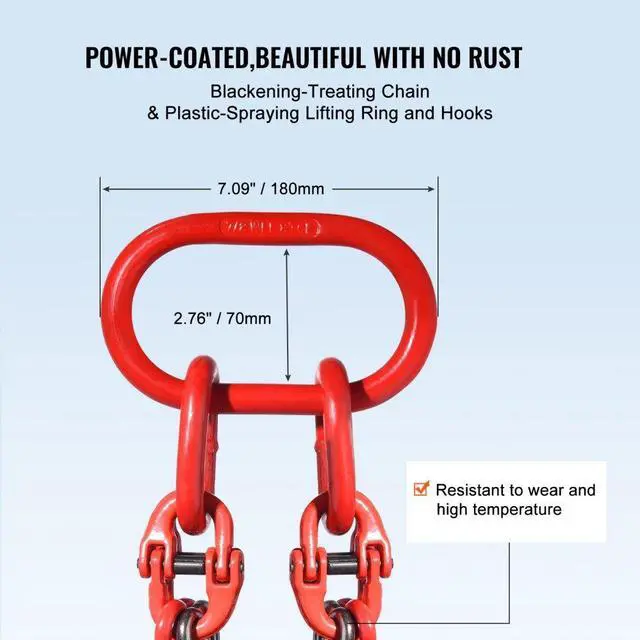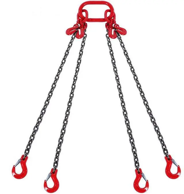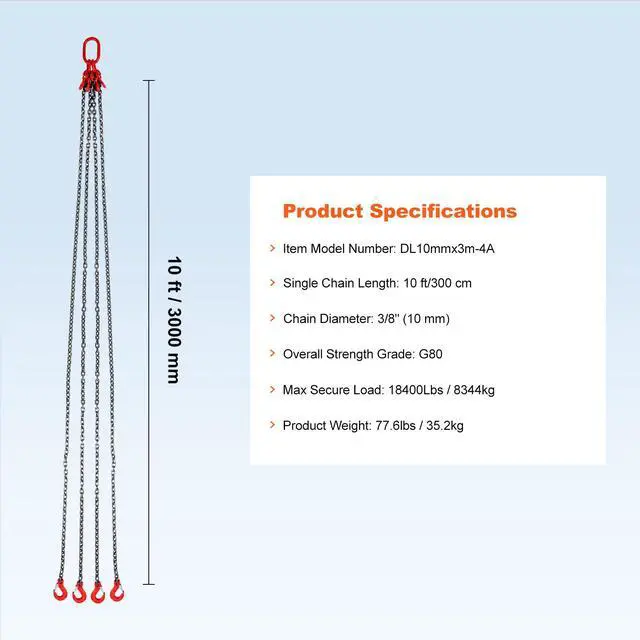VEVOR 3/8" x 10' Chain Sling 4 Legs G80 Lifting Chain with Grab Hooks 18400 lbs G80 Chain Critical Coating Adjustable Hook Wide Applications Designed with You in Mind Secure Hook Design Single Chain Length: 10 ft/300 cm, Item