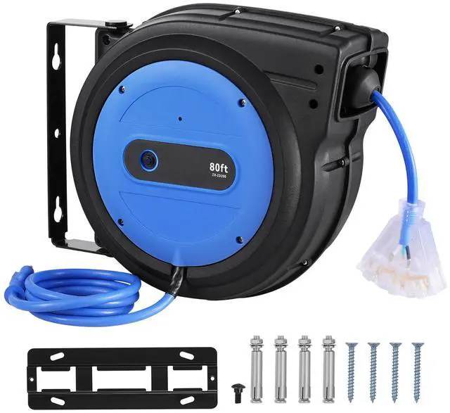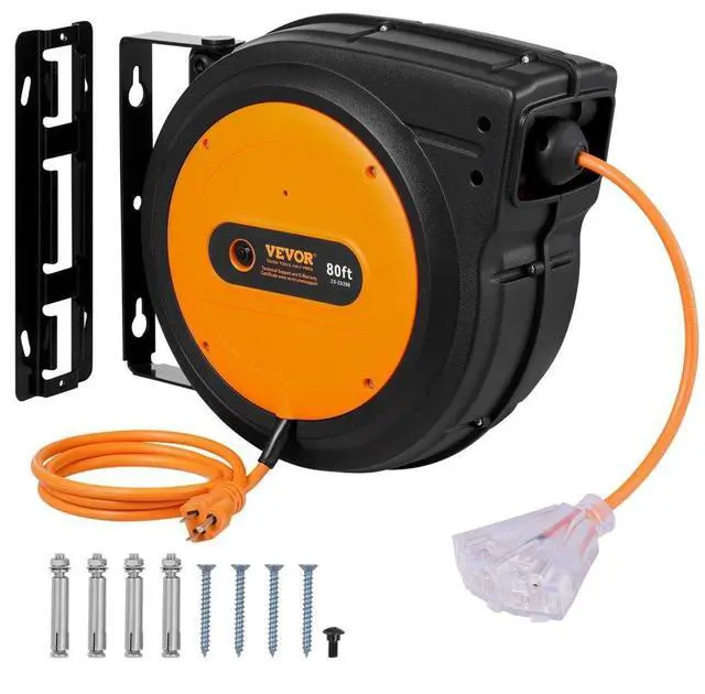 VEVOR Retractable Extension Cord Reel Power Cord Reel 80FT 12AWG/3C SJTOW Easy Access to Electricity Security First SJTOW Cable Versatile Application Hassle-Free Installation Impact-Resistant