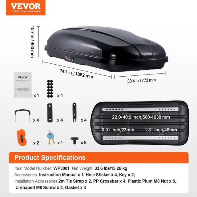 VEVOR Rooftop Cargo Carrier 14 Cubic Feet Luggage Storage Box ABS for SUVs Cars Universal Compatibility Dual Side Opening Durable Heavy-duty Material Streamlined Design Anti-theft Lock Bottom