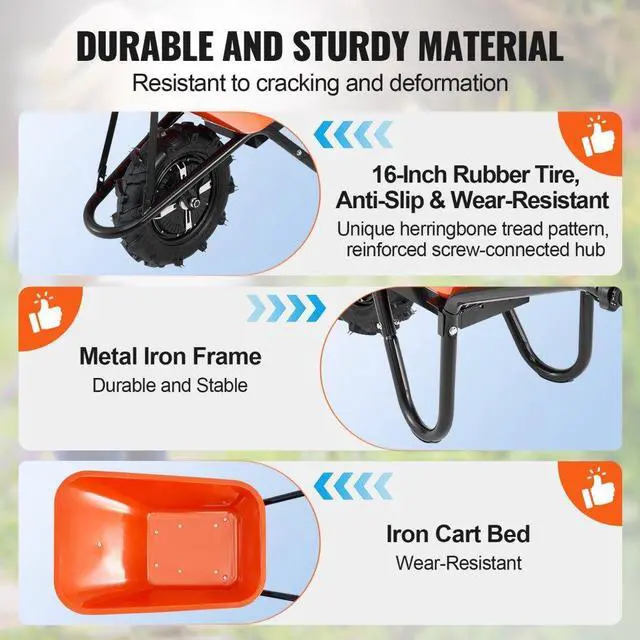 VEVOR Electric Wheelbarrow Cart, 500W Powered Utility Garden Wagon Dump Cart, 4 Cu. Ft. Load & 330 lbs Capacity with Metal Handle & 16" Track Wheels, One Wheel Barrow Yard Cart & Wagons for Lawn Farm Gardening Helper Easy to Operate Durable Construction Simple Installation Versatile Use Easy