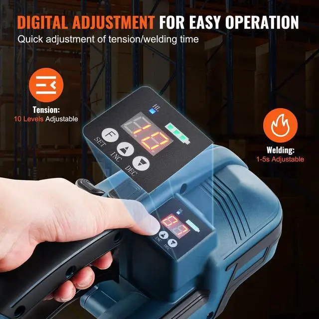 VEVOR Automatic Electric Strapping Machine Tool for PP/PET 0.35" - 0.63" Straps Works with PP & PET Straps High-Capacity Lithium Batteries Strong Tension Easy Digital Controls Perfect for Many Industries Compact and Lightweight