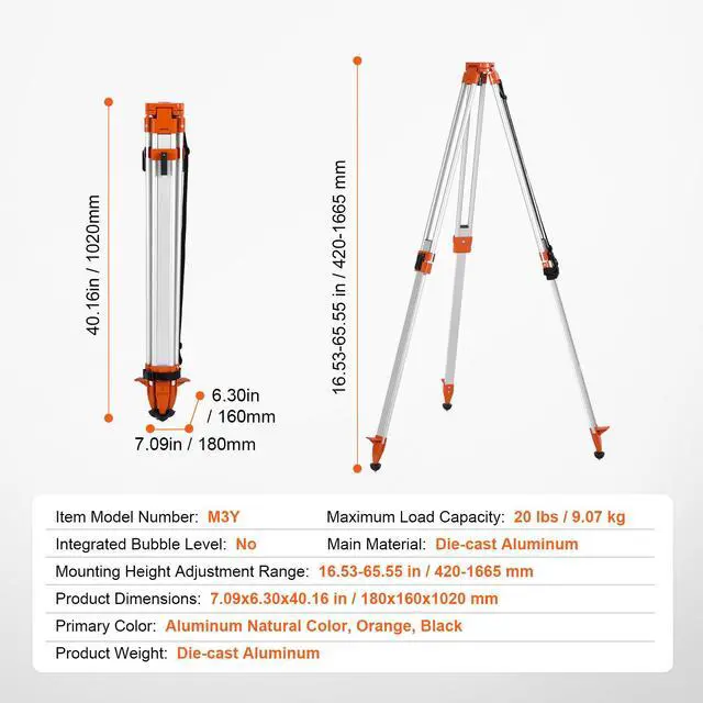 VEVOR Laser Level Tripod Stand 5/8"-11 Thread 16.53 - 65.55 in Height Adjustment High Performance High Stability Easy Installation Thoughtful