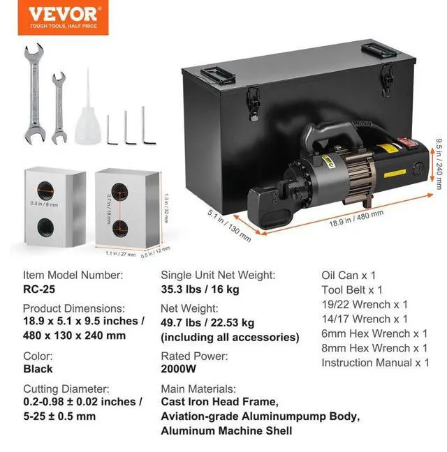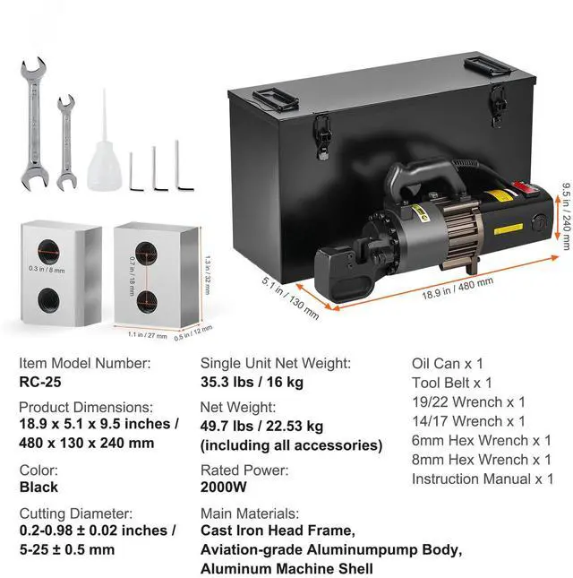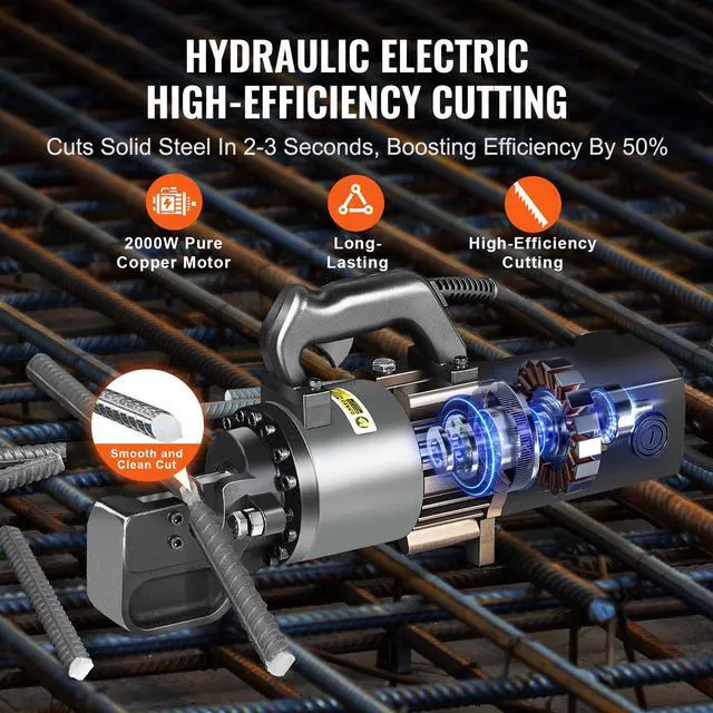 VEVOR 2000W Electric Hydraulic Rebar Cutter Cutting up to 1 Inch #8 4-25mm Efficient Cutting Upgraded Blades Solid Copper Motor Comfortable Operation Multi-scenario Application Reliable Cutting Main Materials: Cast Iron Head Frame, Aviation-grade Aluminumpump Body, Aluminum Machine Shell, Single Unit