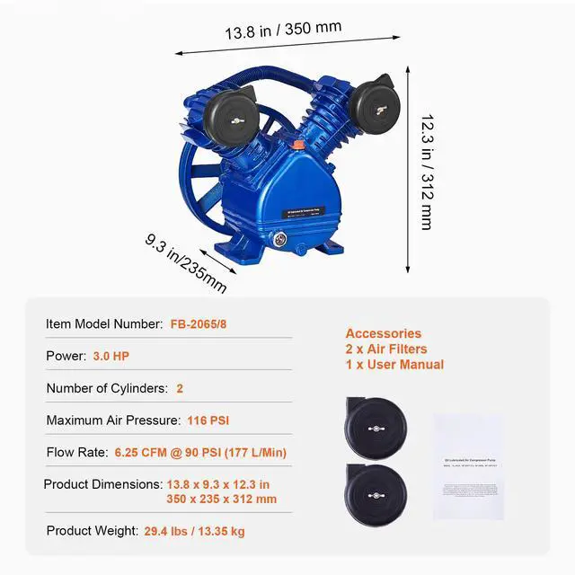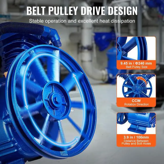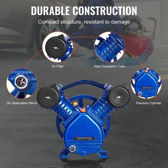 VEVOR Air Compressor Pump Head 3HP 6.25CFM @ 90PSI 2-Cylinder Piston Pump Head Belt-Driven Design High Efficiency Built to Last Oil Observation Window Installation Precautions Wide