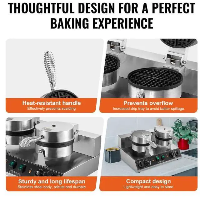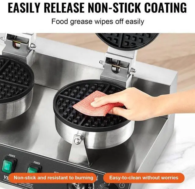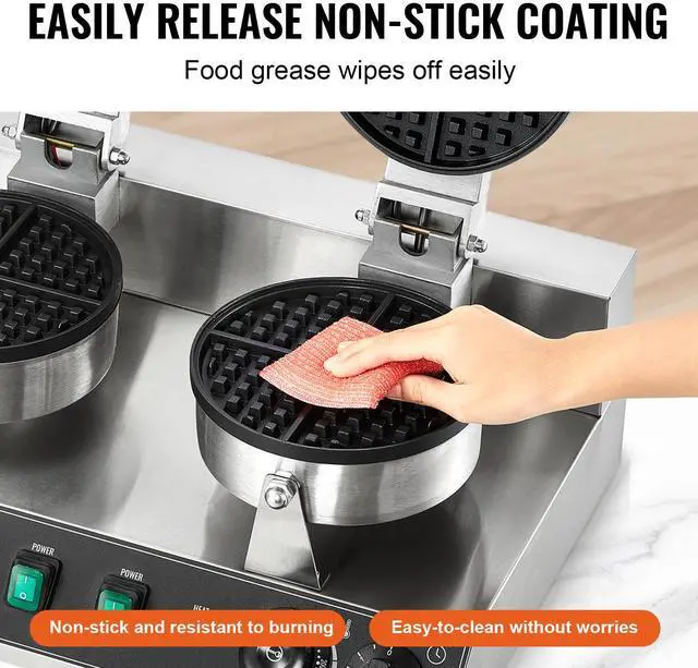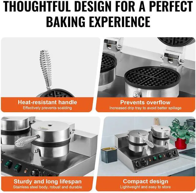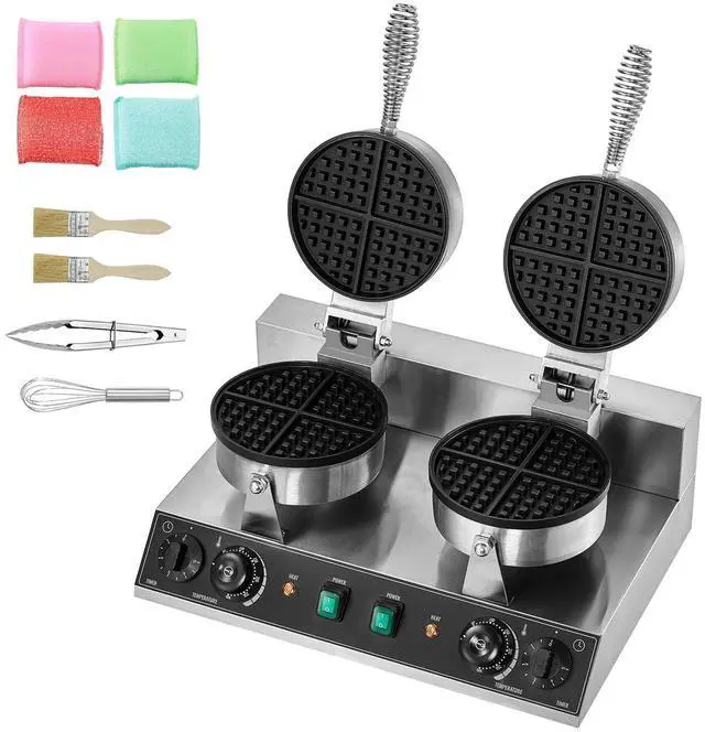 Commercial Waffle Maker, Dual-Head Round Waffle Baker Machine, 2460W Non-Stick Stainless Steel Belgian Waffle Iron with Temp and Time Control, Handle, for Restaurant Bakery Snack Bar Family