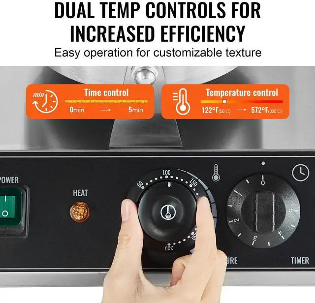 • Dual Temperature Control Design: The dual-sided waffle iron features independent control panels, allowing simultaneous cooking of two waffles. The temperature control knob (122-572°F / 50-300°C) lets you adjust according to your preferences. Customize it to create personalized waffles, whether you prefer them crispy or fluffy. With individual preparation and audible alerts, it's easy to operateit reminds you to add batter and indicates when the waffles are cooked, so you don't have to watch it constantly.