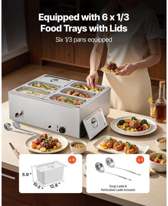 VEVOR 6-Pan Commercial Electric Food Warmer Countertop Buffet 6*8Qt Pan Bain Marie Commercial Food Warmer Includes 6 Pan Adjustable Temperature Dry-Burn Protection System Versatile Usage Wide