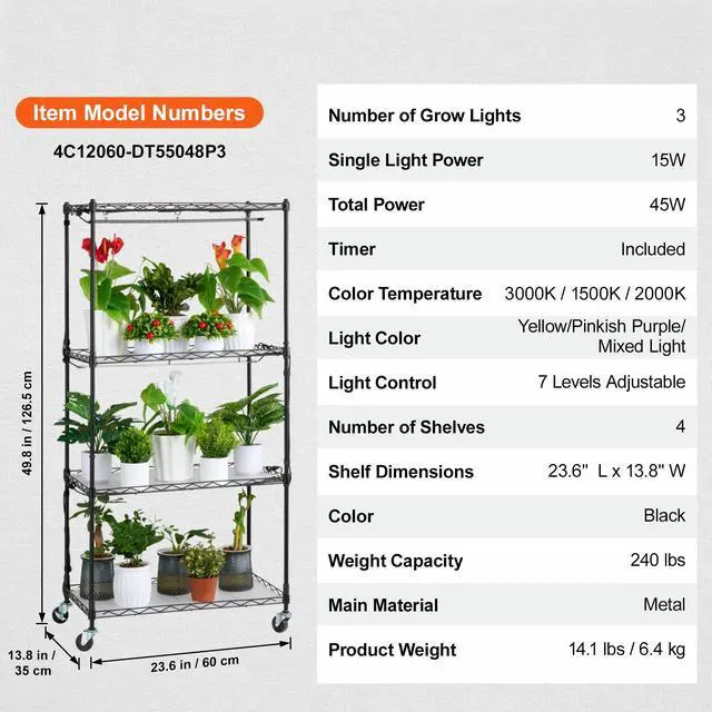 VEVOR Plant Stand with Grow Light, 4-Tier Plant Shelf with 45W Full Spectrum Grow Light, 3 Mode Plant Light with Timer and Wheel for Seed Starting, Metal Grow Light Shelf for Indoor Plants Plant Grow Shelf Electronic Timer Grow Light Parameters Convenient & Secure Design Easy Installation Secure Features Number of