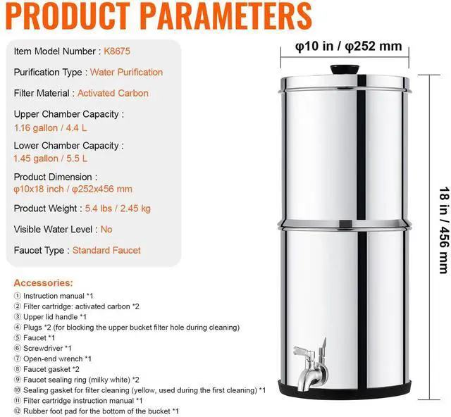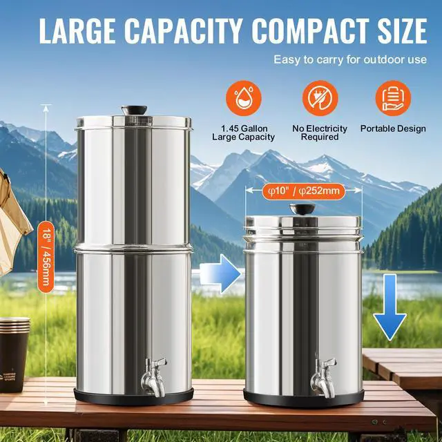 VEVOR 1.5G Gravity-fed Water Filter Countertop System Stainless Steel 2 Filters High-Quality High Efficiency Filtration Durability and Strength Multiple Convenient Designs Suitable for Multiple Scenarios Handle on the Lid