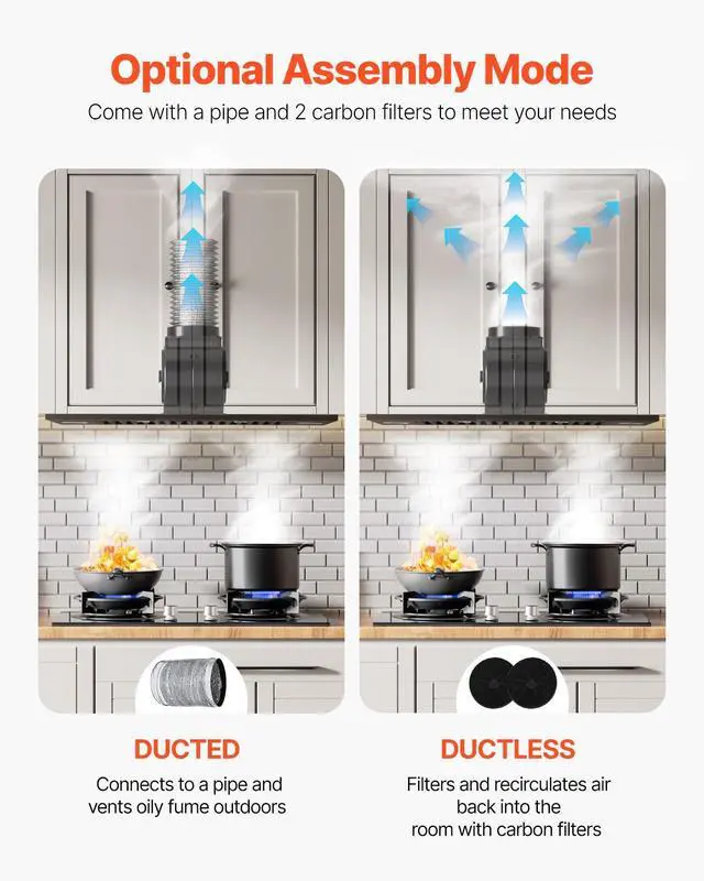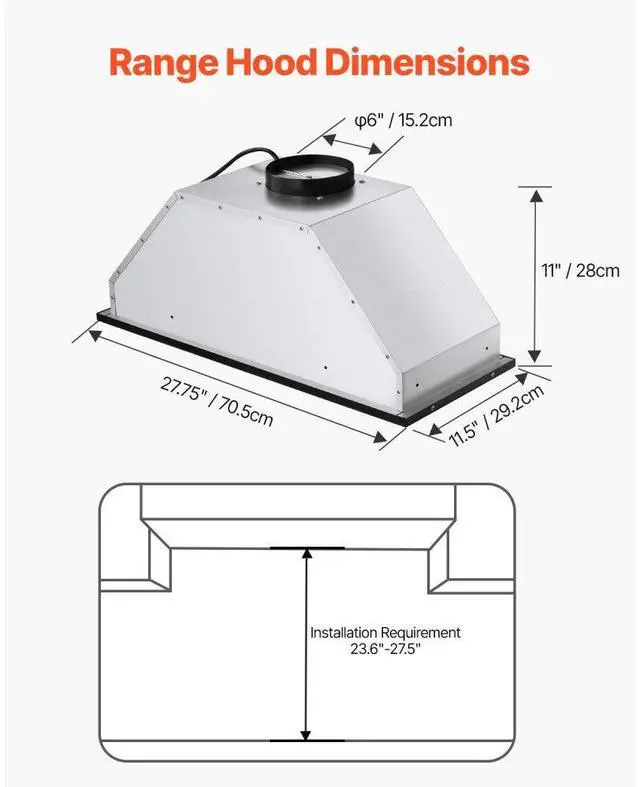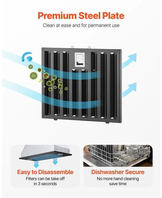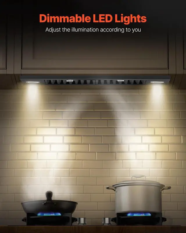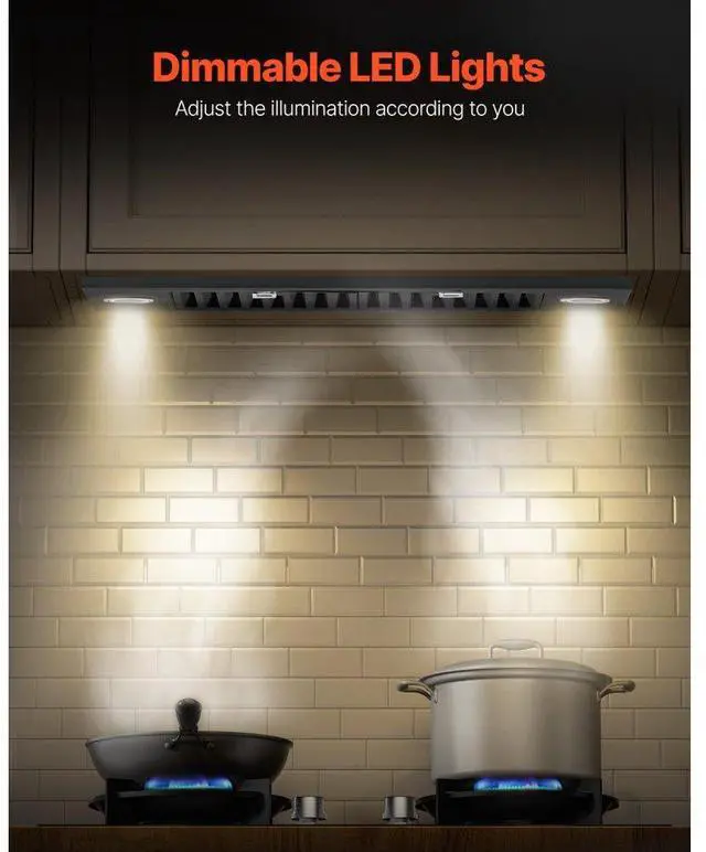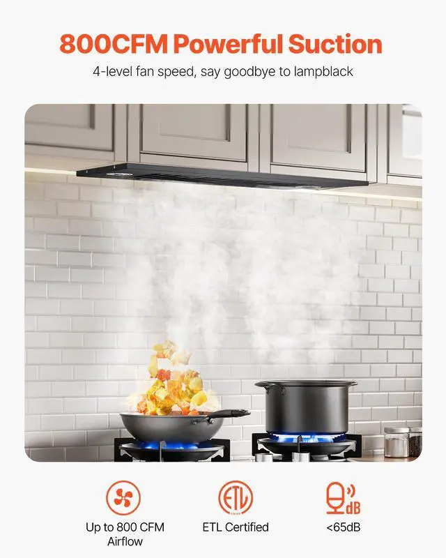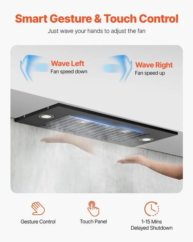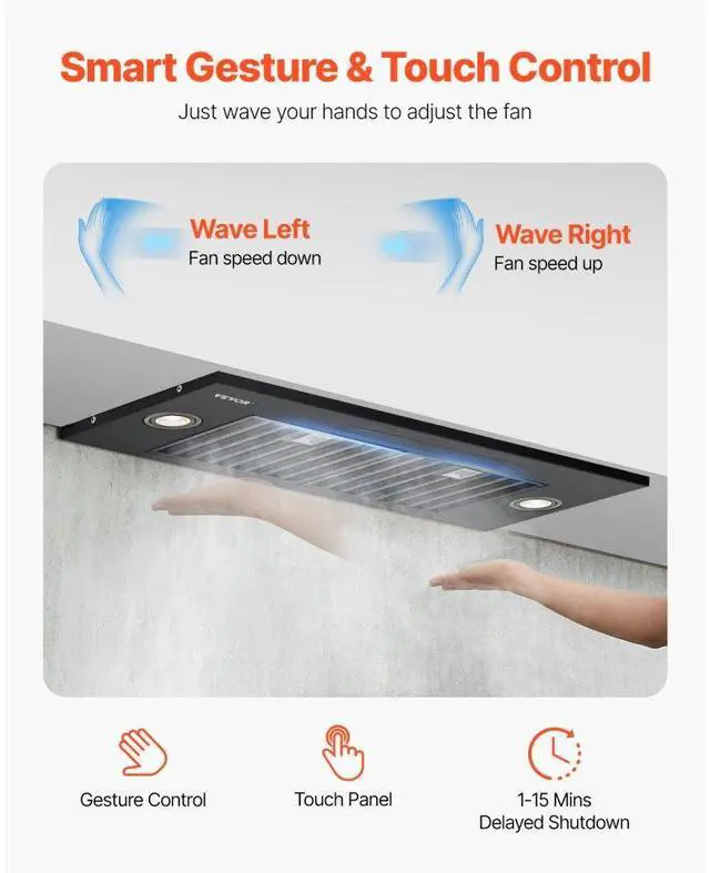 VEVOR 30in Built-in Range Hood Insert Vent Hood 800CFM Gesture & Touch Control 800 CFM Suction Power Easy-to-Clean Structure Advanced Gesture & Touch Controls Ultra-Quiet Operation Optional Ways to Assemble Adjustable Dimmable LED Lighting