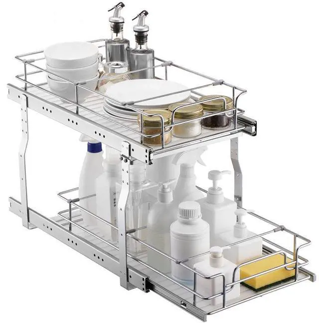 2-Tier 12"Wx21"Dx15"H Wire Pull Out Cabinet Under Sink Organizer Drawer Basket, 13.5"W x22"Dx18"H Install Size for Cabinet Flexible Division Placement PP Matte Board Pads Sturdy and Durable Structure Easy Installation and Use Double-Layer Space-Saving Storage Ball Bearing Guide Rails Item Size: 12.1 x 21.0 x 15.2 inch / 305x533x385 mm, Item
