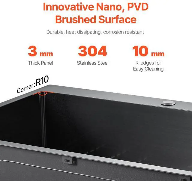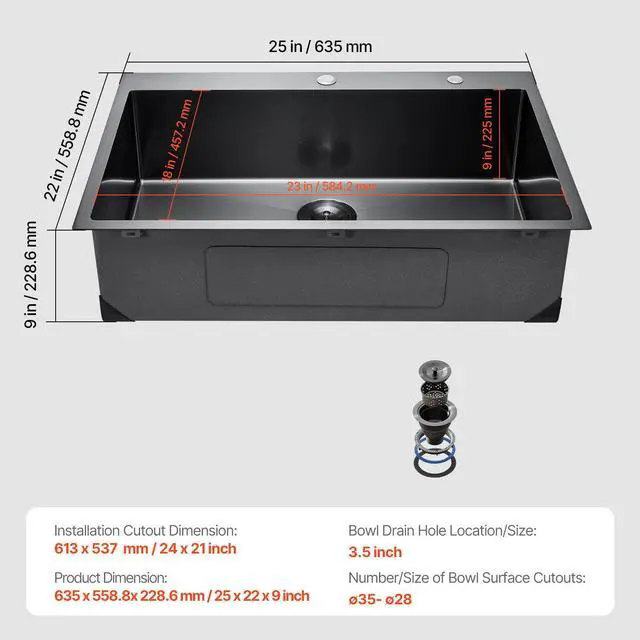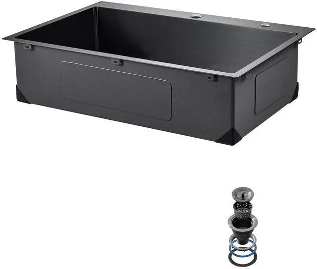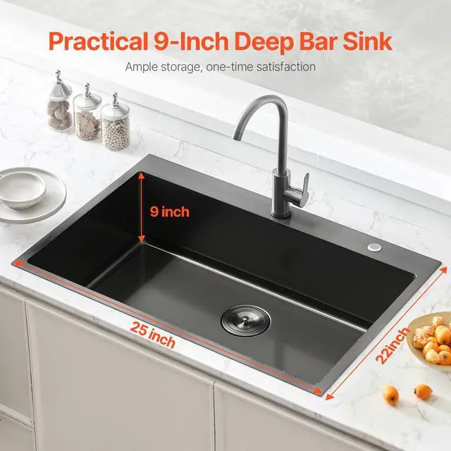 25" Kitchen Sink Top Mount Single Bowl Drop-In Basin Stainless Steel Black Practical Design High Quality Nano Black Finish Soundproofing and Anti-Condensation Technology Quick and Thorough Drainage Design Top-Mount Sink Installation Easy to Clean and Maintain Bowl