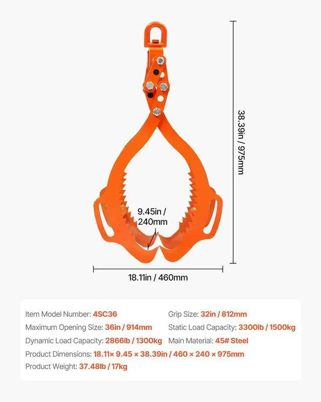 36in Log Lifting Tongs 4 Claw Solid Steel Log Grapple Swivel Log Tools Heavy-Duty Capacity Versatile Use Wide Compatibility Sturdy Construction Easy Operation Powder