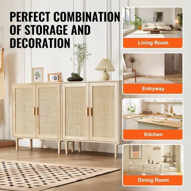 VEVOR Rattan Cabinet, Set of 2, Rattan Storage Cabinet with 4 Magnetic Doors and Adjustable Shelves, Sideboard Buffet Cabinet for Hallway, Entryway, Living Room, or Kitchen, Natural Rattan Decorative Cabinet Ample Storage Space Thoughtful