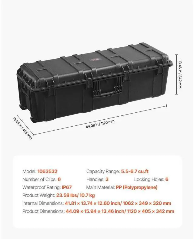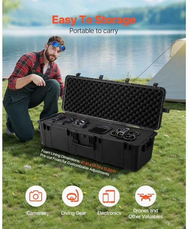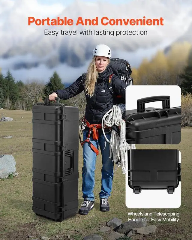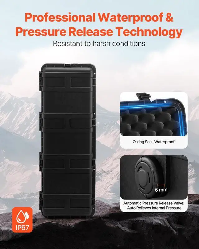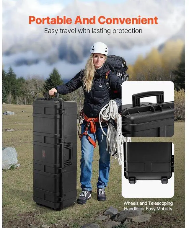 VEVOR Weatherproof Hard Case, Heavy Duty Protective Dry Box Case with Pre-Cut Foam & Retractable Pull Handles for Travel, Hunt, Military, Tactical, IP67 Waterproof Case for Cameras (112x41x34) All-around Protection Customizable Interior Professional Waterproof Design Anti-theft Security Automatic Pressure Relief Device Easy to Move & Carry Number of