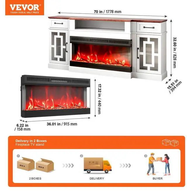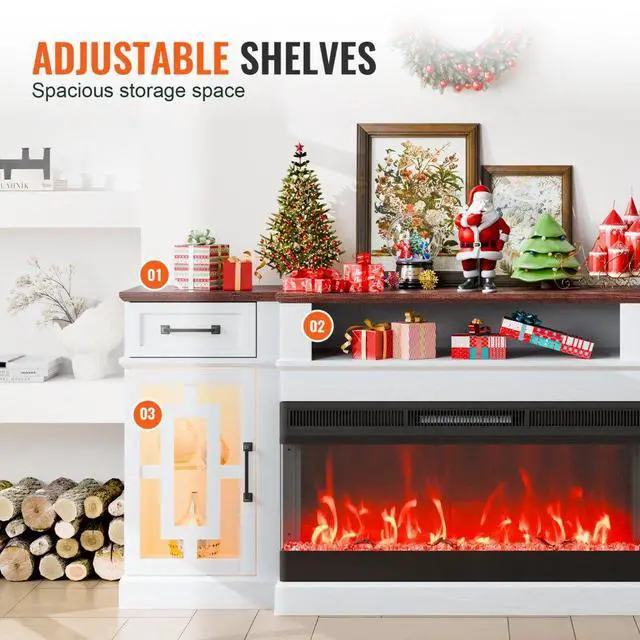 VEVOR 80 in Fireplace TV Stand 20 LED Lights Remote Control & Timer Brown+White Multi-functional Fireplace TV Stand Visible Storage Space User-friendly Design Easy 4-step Assembly Versatile Application 20