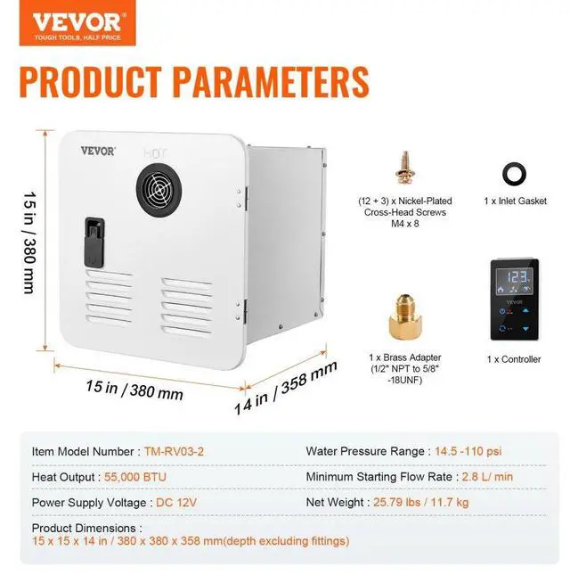 VEVOR RV Tankless Water Heater, Instant Shower with 15 x 15 inches White Door and Remote Controller, 55000BTU Optimized Comfort Performance Hot Water, Ideal for RVers' Family Everyday Use Instant Heating Water Heater Year-Round Comfort Comprehensive Safety Protection RV-Ready Design Easy Assembly Premium Materials Minimum Starting