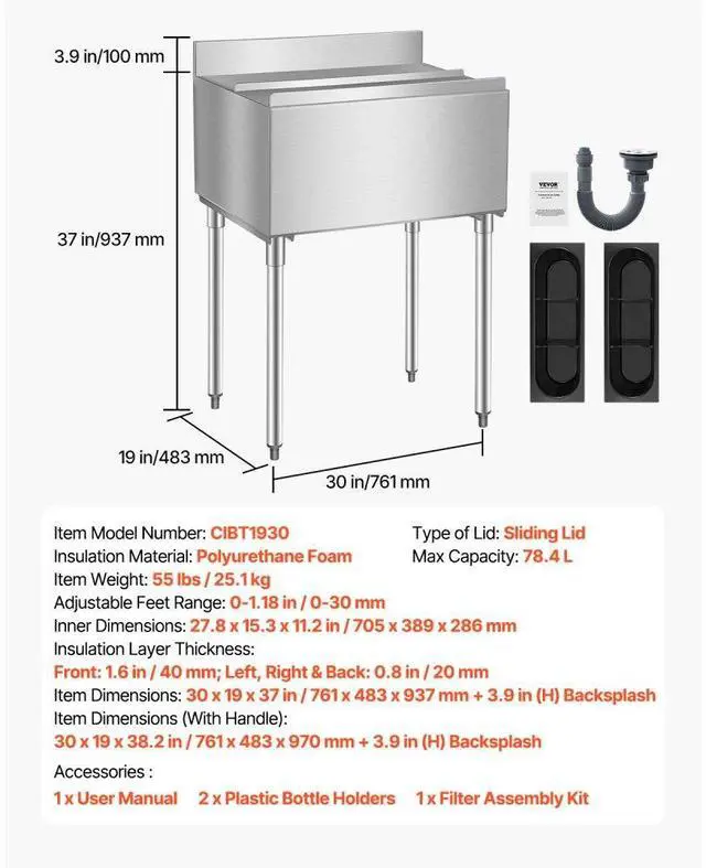 Dimensions (With Handle): 30 x 19 x 38.2 in / 761 x 483 x 970 mm + 3.9 in (H) Backsplash, Insulation
