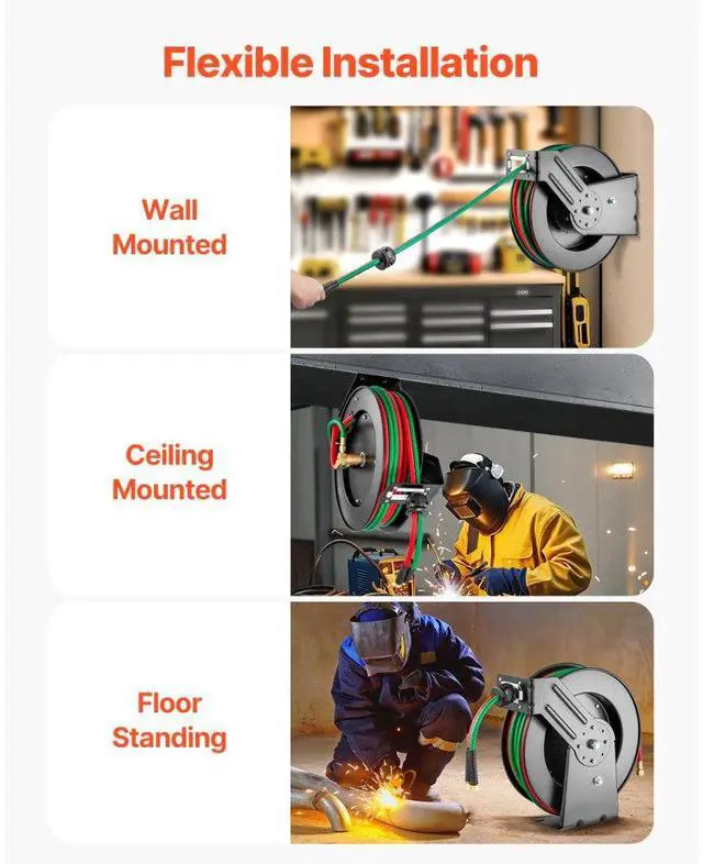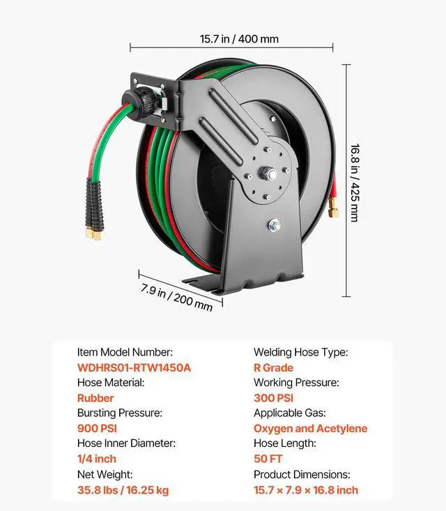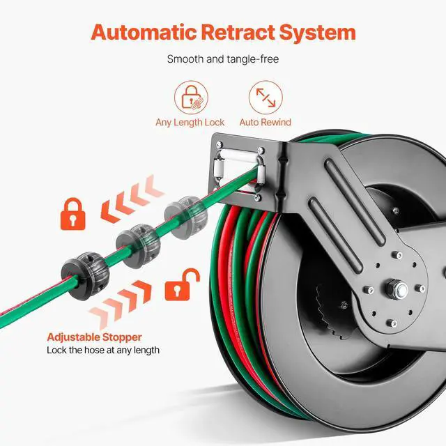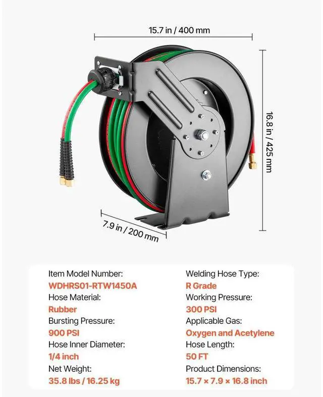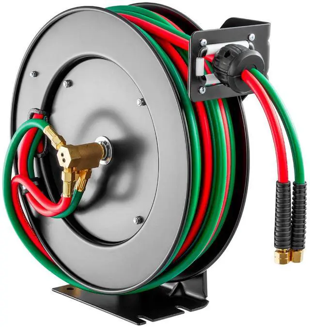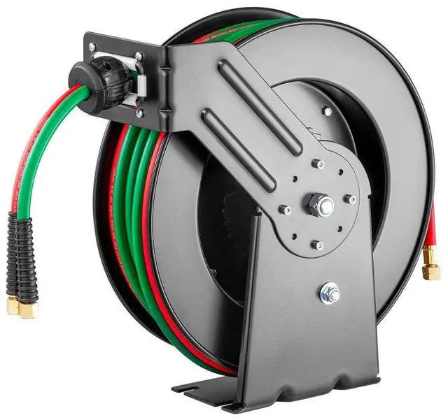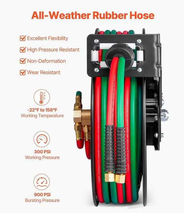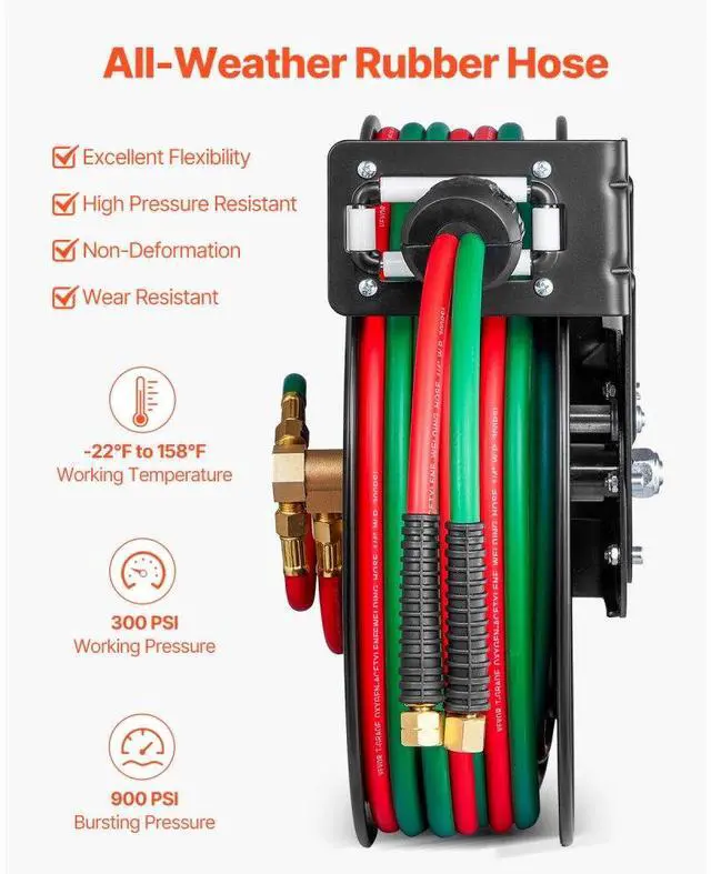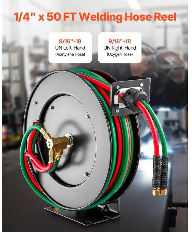Retractable Welding Hose Reel 1/4 in x 50FT Oxygen Acetylene Rubber Hose R Grade All-Weather Durability High Pressure Capability Effortless Hose Retraction Adjustable Stopper Clear Color-Coding Heavy-Duty Welding Hose Reel Applicable Gas: Oxygen and Acetylene,