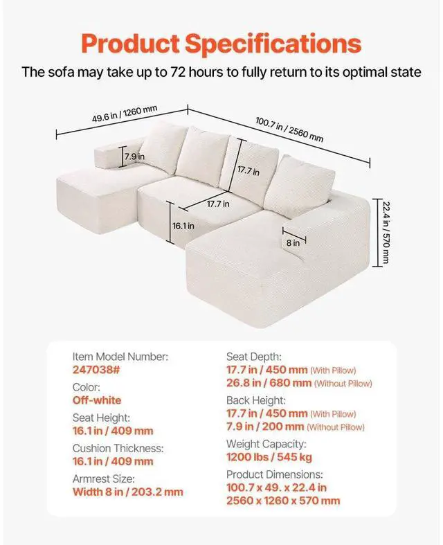 Product Dimensions: 100.7 x 49.6 x 22.4 in / 2560 x 1260 x 570 mm