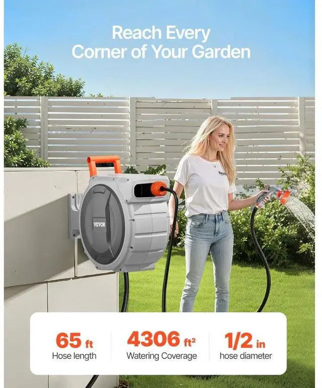 • Wide Coverage: With a 65 ft hose and 6 ft lead hose, this hose reel covers up to 4306 ft²/400, making it ideal for large gardens or distant areas without frequent reel movement. The patented ratchet locking system lets you pull the hose and lock it at any desired length for precise watering.