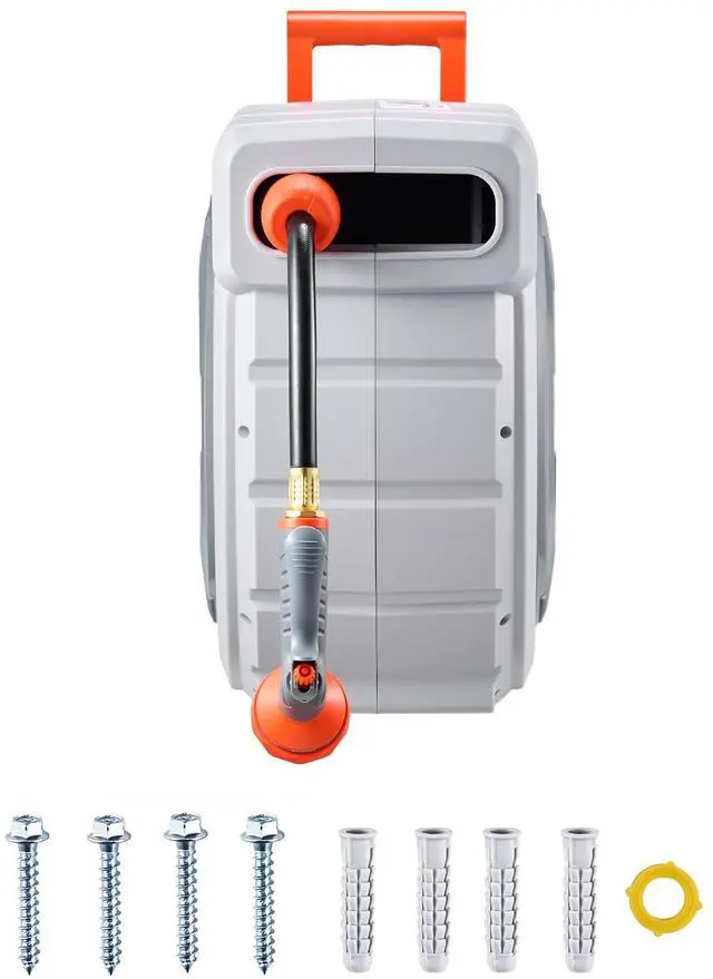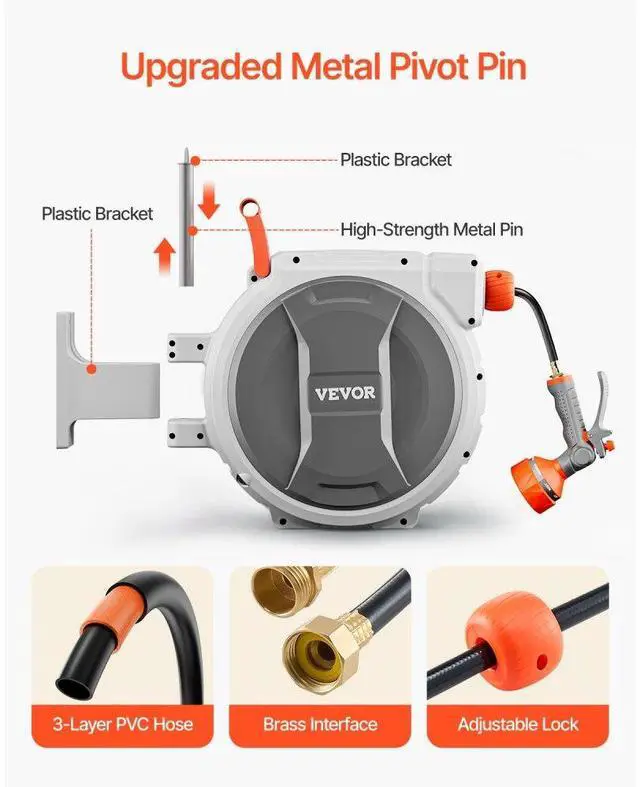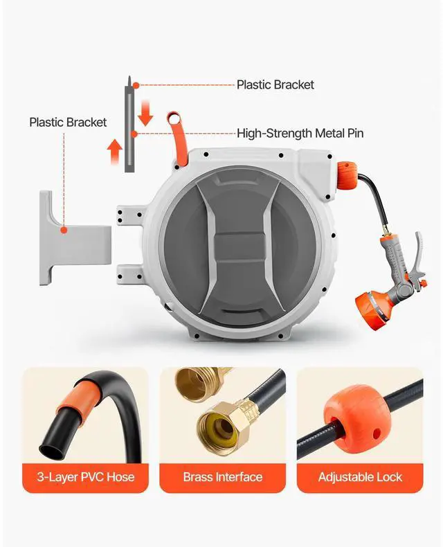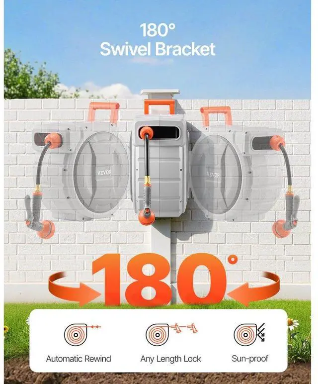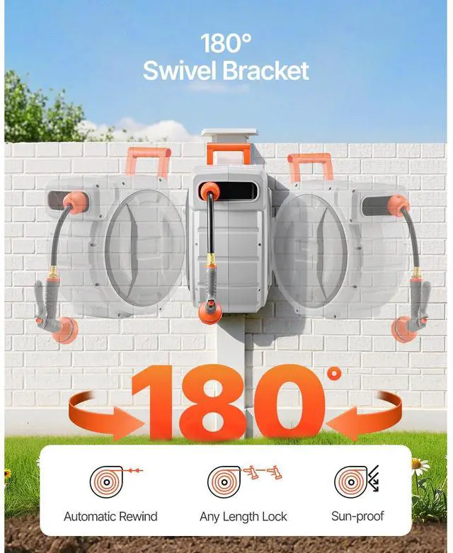 • Upgraded Slow Rewind System: The 10-11.5 second slow rewind system for up to 98ft of hose on the water hose reel avoids fast recoil, ensuring security. The high-quality steel spring supports over 20,000 smooth retractions