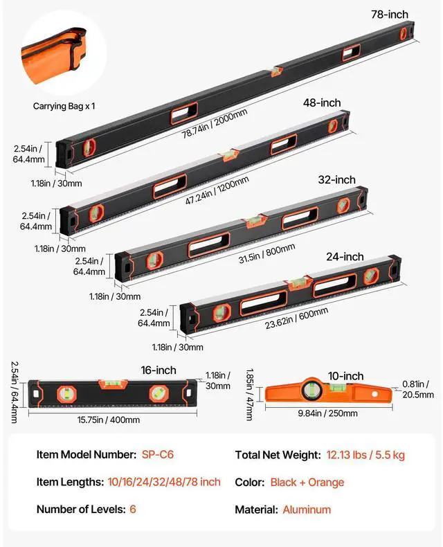 VEVOR 6-Piece Torpedo Level, 78/48/32/24/16/10 Inch All Magnetic Levels Set, Bubble Vials Ruler for 45/90/180 Degree, Aluminum Alloy Magnetic Box Leveler Tool, Shock-Resistance, SAE and Metric Scale ABS & TPE Handle Metal Anti-Slip Pattern on the Side Separate Nylon Storage Bag 3-in-1 Measurement Thoughtful