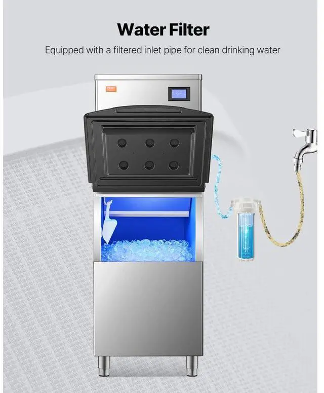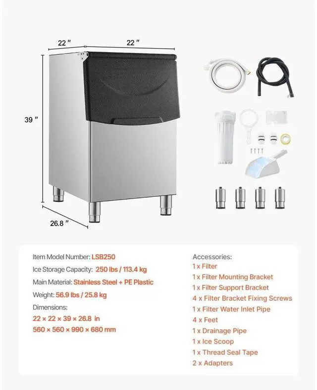 VEVOR Commercial Ice Maker Storage Bin, 250LBS Capacity Ice Bin, Stainless Steel Ice Storage Bin with Filter and Adjustable Anti-Slip Rubber Feet, Suitable for Restaurant Hotel and Beverage Shops Large Ice Storage Drainage & Water Filtration Complete Ice Maker Convenient to Install Wide Application Ideal Pairing Item