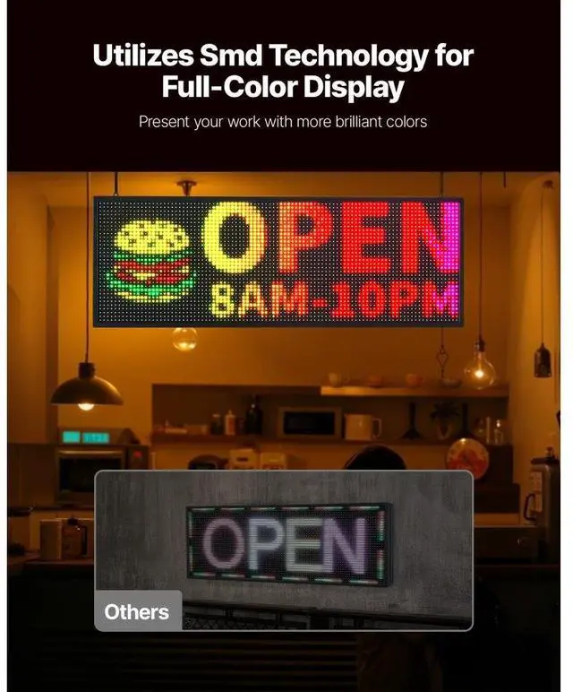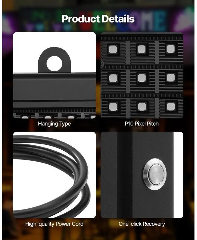 40x14 in Programmable LED Sign Digital Scrolling Display Board P10 Full-color High Brightness Easy to Operate Rich Display Modes High-quality Material Wide Application Convenient Installation Main Materials: Aluminum, ABS, LED Panel, Item
