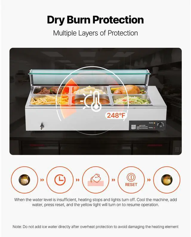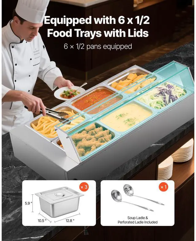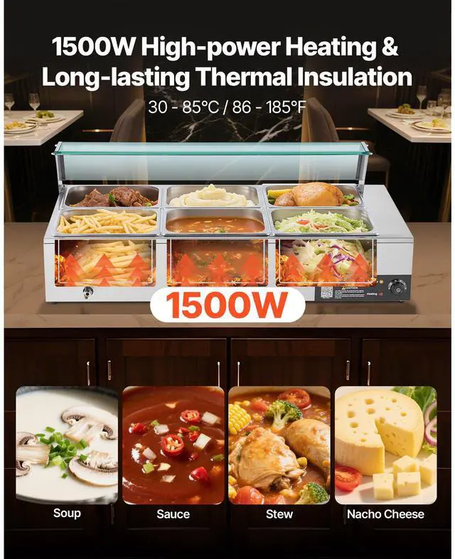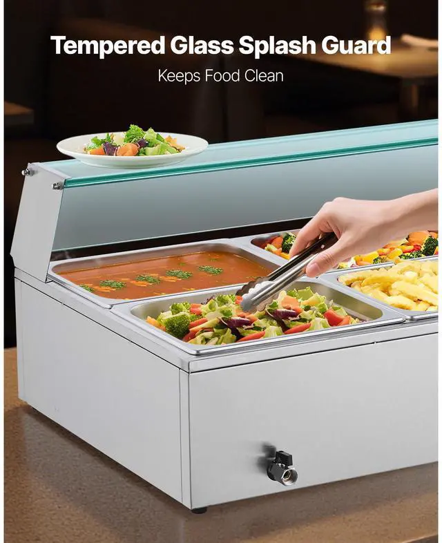 VEVOR Commercial Electric Food Warmer Countertop Buffet 6*8Qt with Glass Shield Commercial Food Warmer with Glass Cover Includes 6 Pan Adjustable Temperature Dry-Burn Protection System Versatile Usage Wide