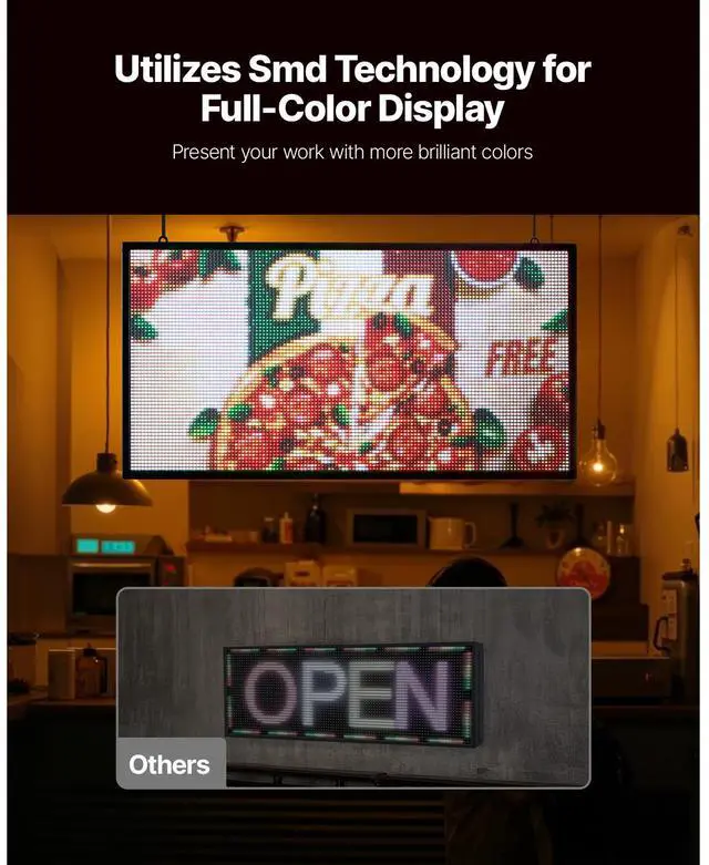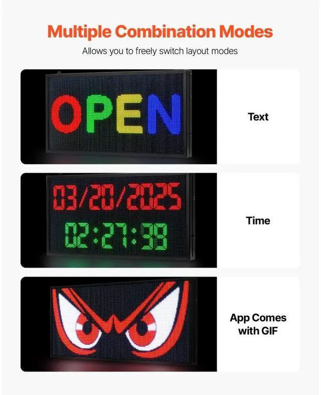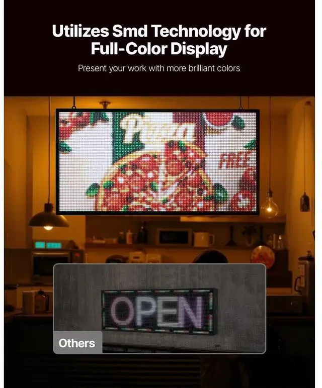 27x14 in Programmable LED Sign Digital Scrolling Display Board P5 Full-color High Brightness Easy to Operate Rich Display Modes High-quality Material Wide Application Convenient Installation Main Materials: Aluminum, ABS, LED Panel, Item