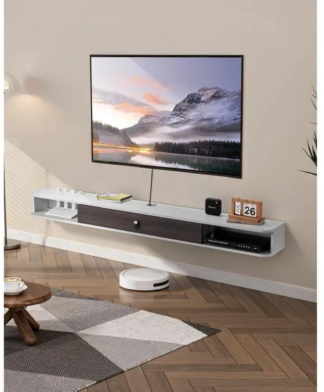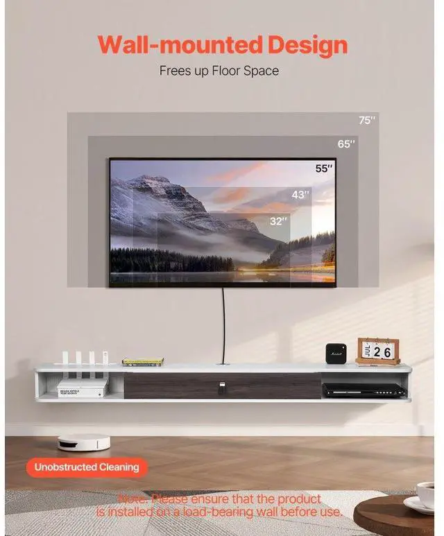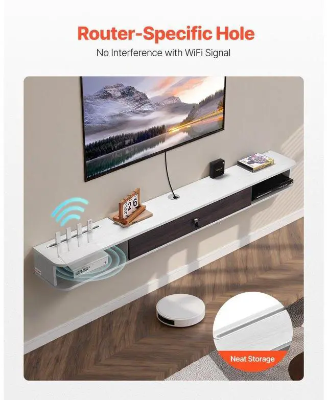 VEVOR Floating TV Stand, 70 in Wall Mount Entertainment Center with Cable Hole, Modern Floating TV Shelf with Storage Cabinet, Particle Board Console for DVD Player, Cable Box, Game Console, White Smart Multi-Functional Design Efficient Storage Privacy Protection Reinforced Design Easy Installation & Quick Setup Versatile Modern