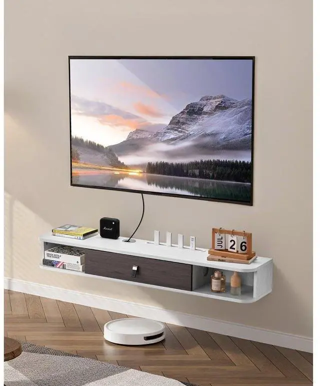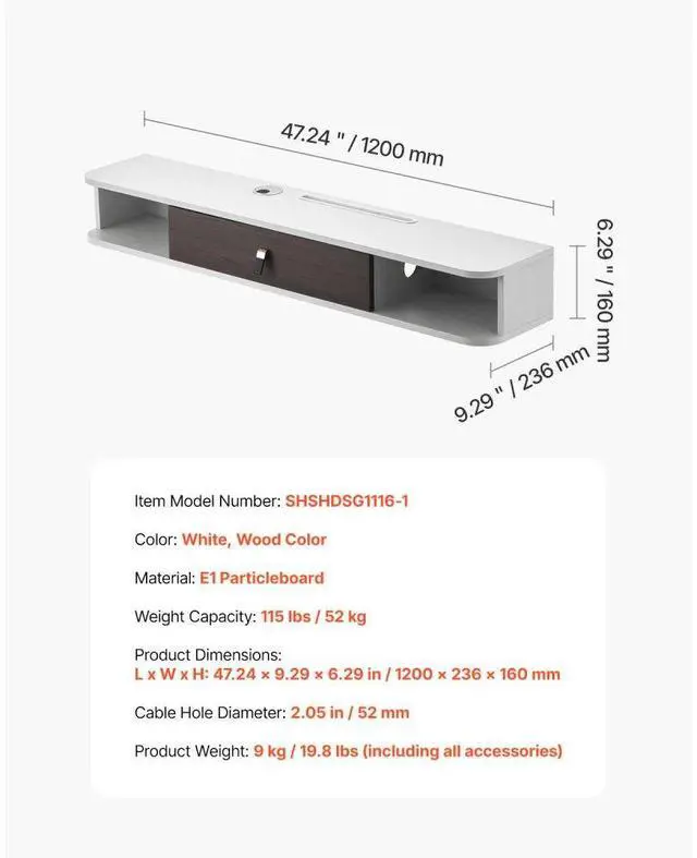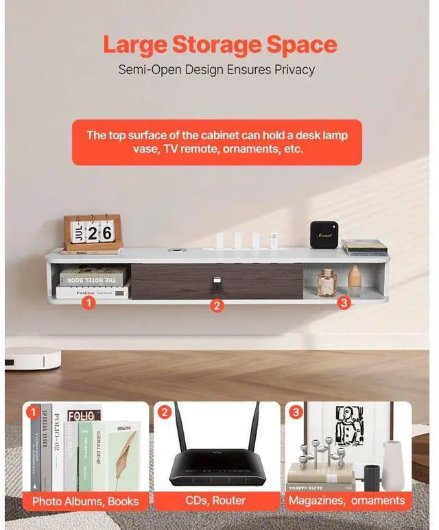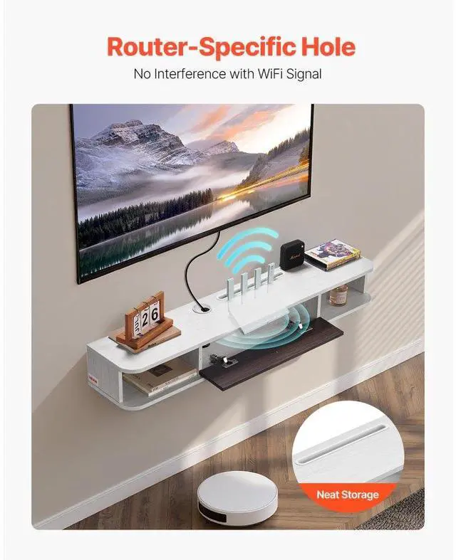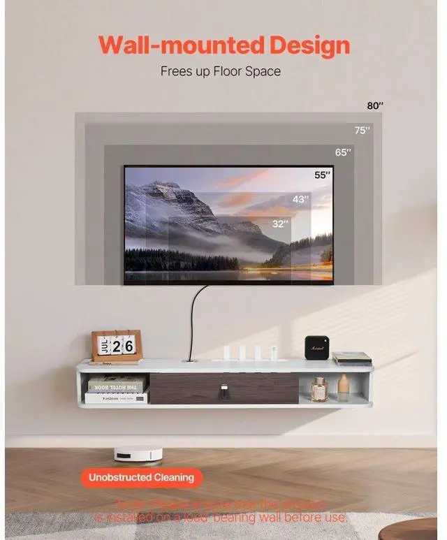 VEVOR Floating TV Stand, 47 in Wall Mount Entertainment Center with Cable Hole, Modern Floating TV Shelf with Storage Cabinet, Particle Board Console for DVD Player, Cable Box, Game Console, White Smart Multi-Functional Design Efficient Storage Privacy Protection Reinforced Design Easy Installation & Quick Setup Versatile Modern