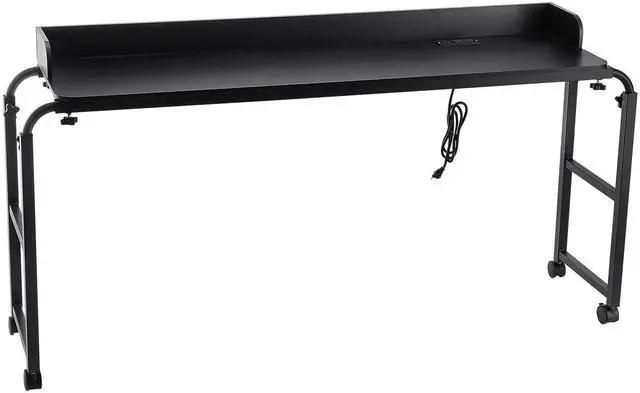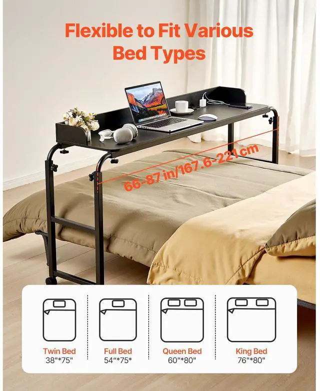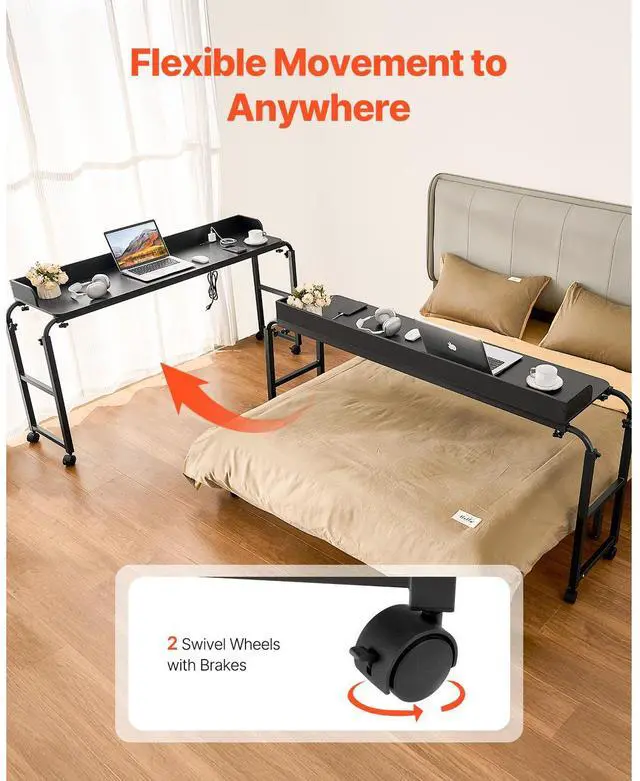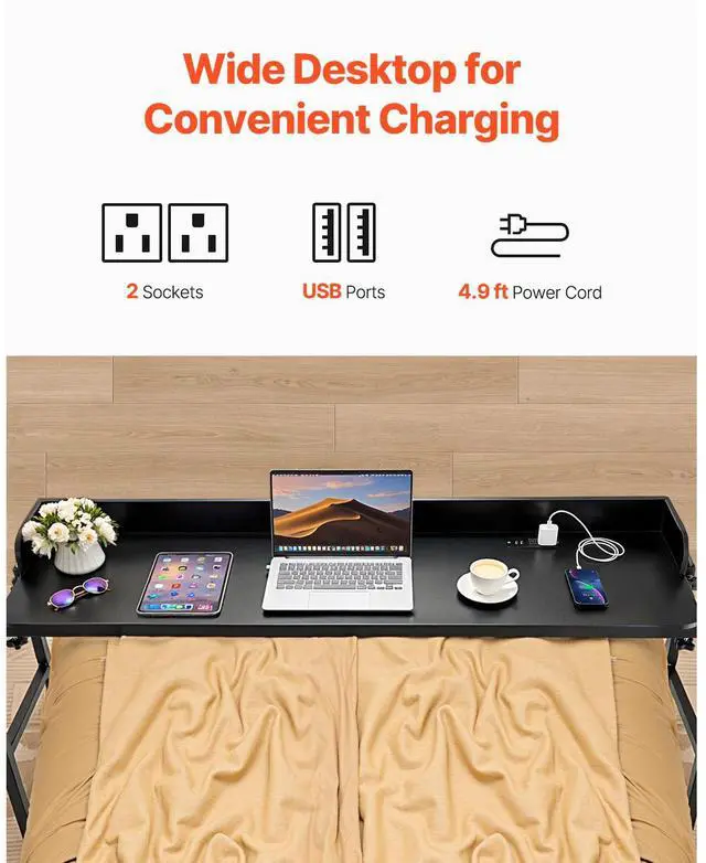 VEVOR Overbed Table: A Black Beauty! Mobile Bedside Table with 4 Wheels (2 Braked), Power Socket, and Adjustable Height. Made of ParticleboardPerfect for Home, Office, and Study Adjustable Overbed Table Convenient Charging Spacious Desktop Movable & Space-Saving Durable Materials Easy to Assemble & Clean
