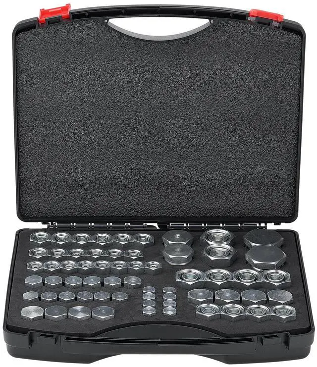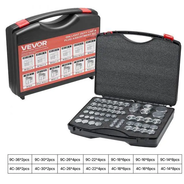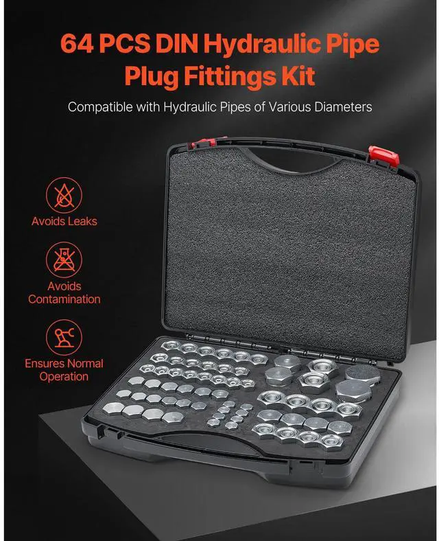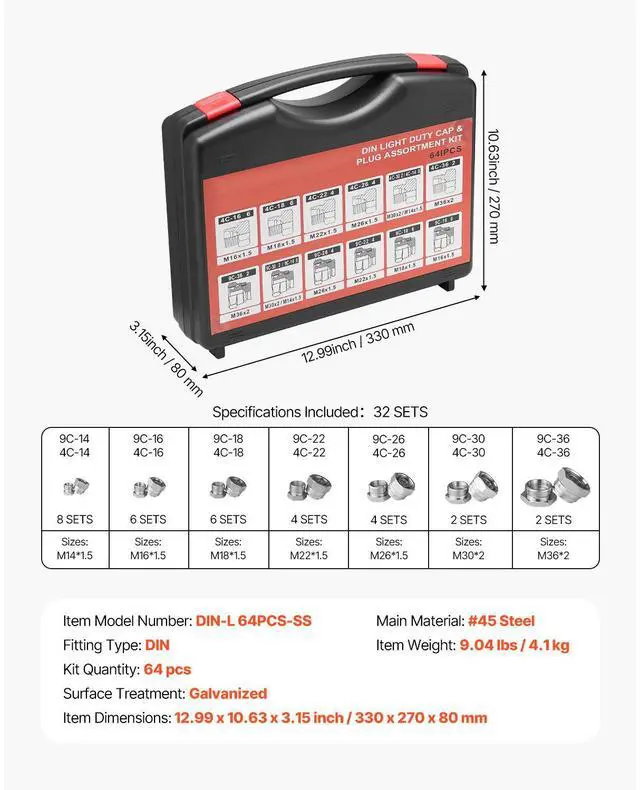 64 PCS DIN Hydraulic Fitting Cap & Plug Assortment Adapter Kit Galvanized Set 64 PCS Hydraulic Pipe Plug Set Premium Galvanized #45 Steel Construction Precision Threading Organized Storage Box Design Wide Range of Applications Outstanding Performance Hydraulic Pipe Plug Kit 4C-30: M30 x 2, 9C-22: M22 x 1.5, 9C-30: M30 x 2, 9C-36: M36 x 2, 9C-14: M14 x 1.5, Kit