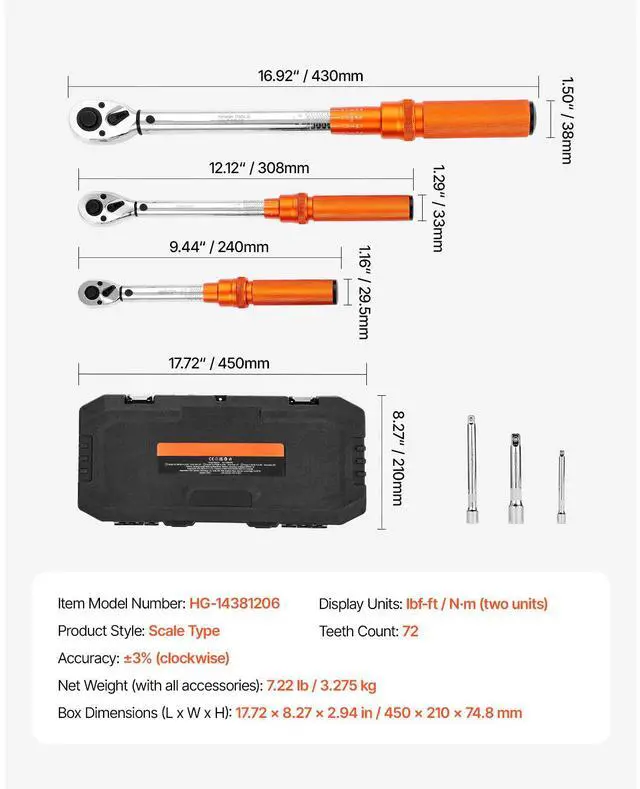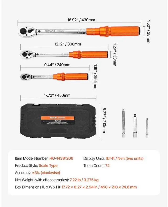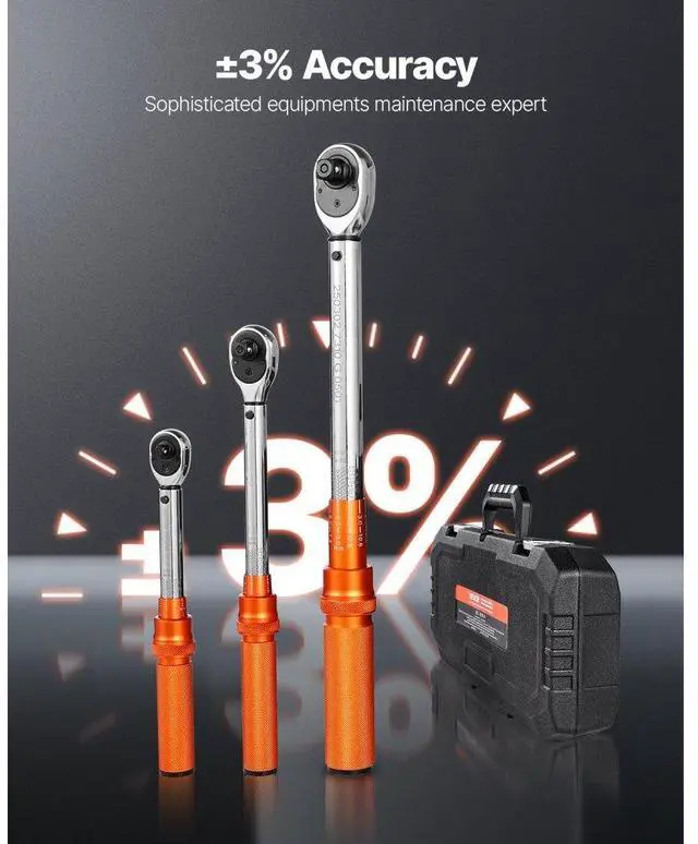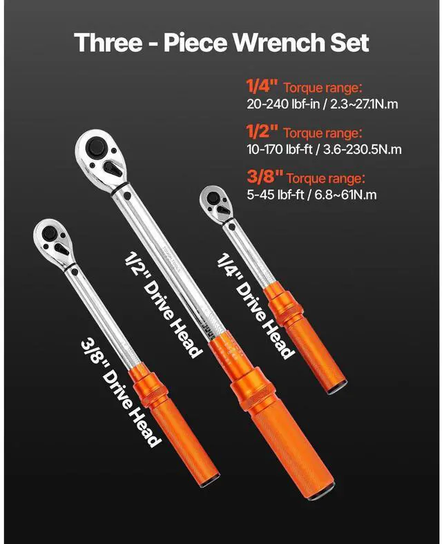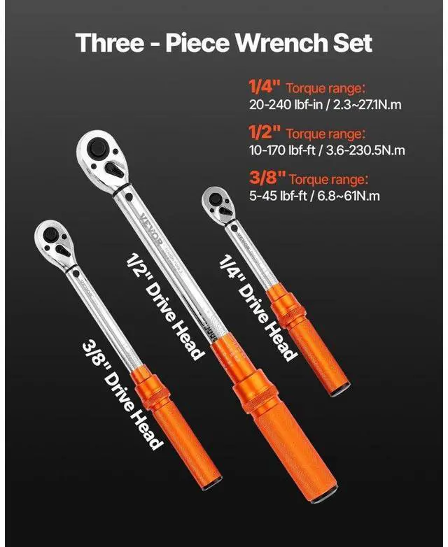 Click Torque Wrench Set 3 Pcs 1/4 3/8 1/2 Inch Drive Dual-direction 72-Tooth ±3% High Precision Suitable for Various Work Environments Precise Readings Automatic Notification Portable Tool Case 72-Tooth