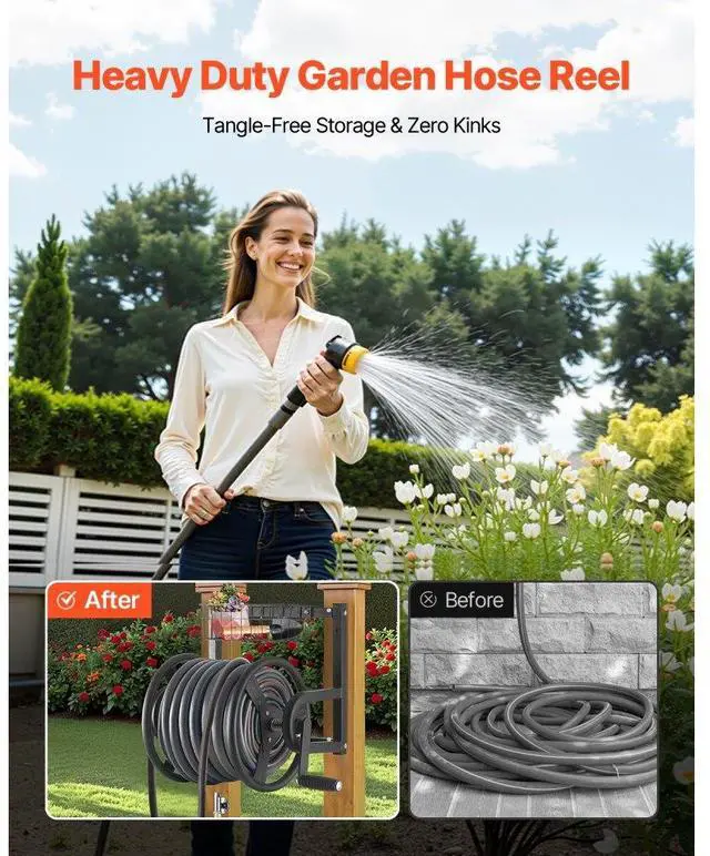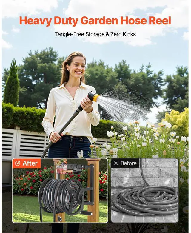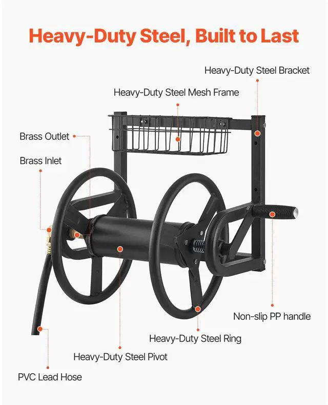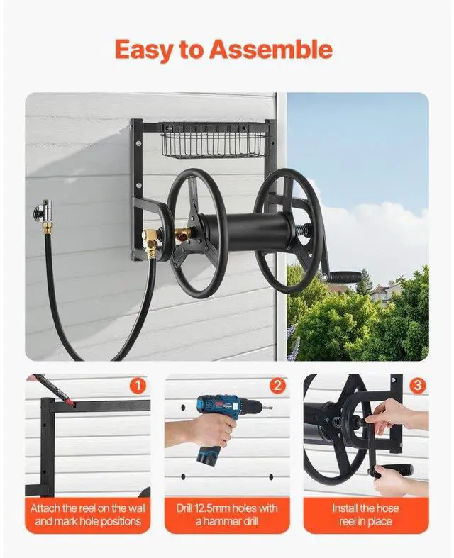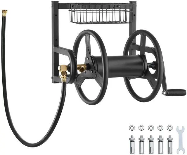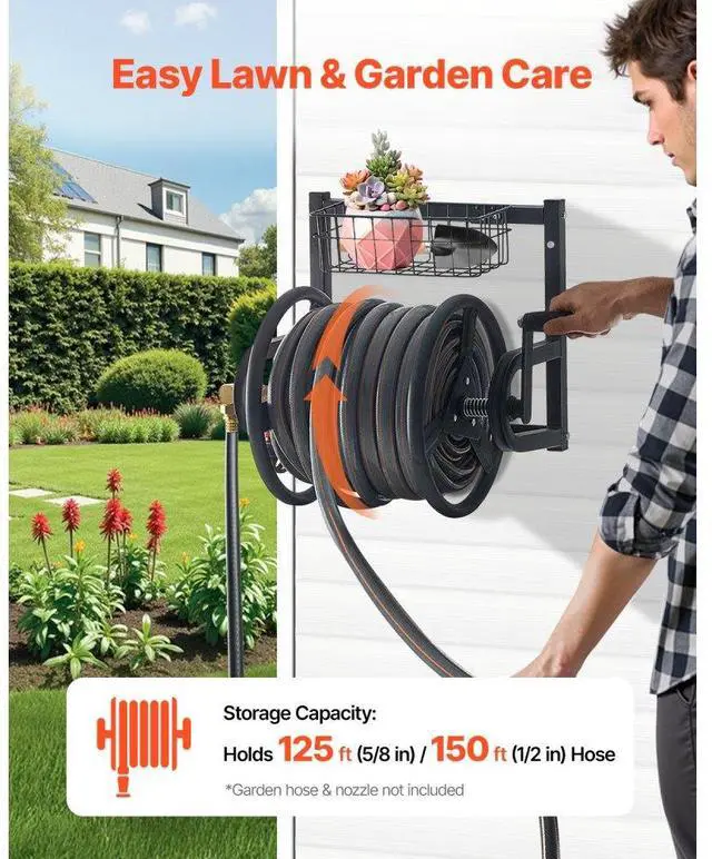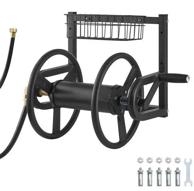 Wall Mounted Garden Hose Reel 125ft 5/8 in Hose Holder Brass Fitting & Basket Keep Your Garden Tidy Sturdy and Durable 4 Simple Installation Steps Comfortable Operation Wall-Mounted Design Inlet &