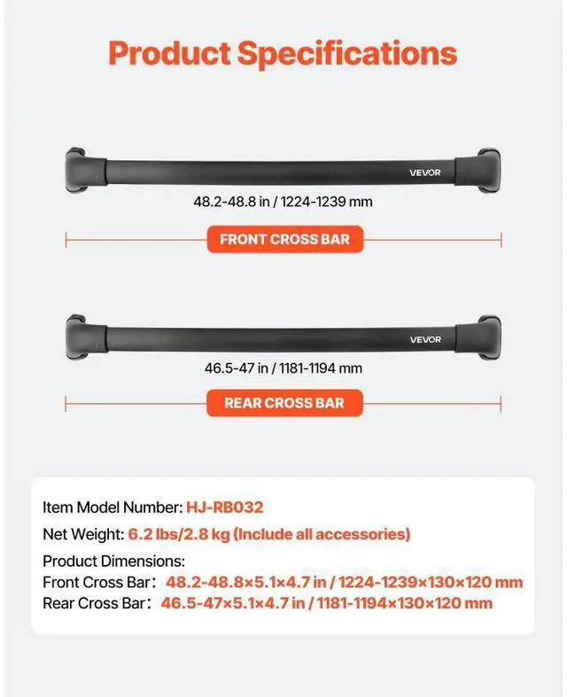 Cross Bar: 48.2 - 48.8 x 5.1 x 4.7 inch/1224-1239 x 130 x 120 mm, Item