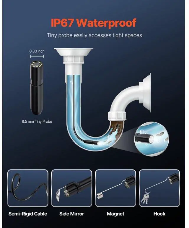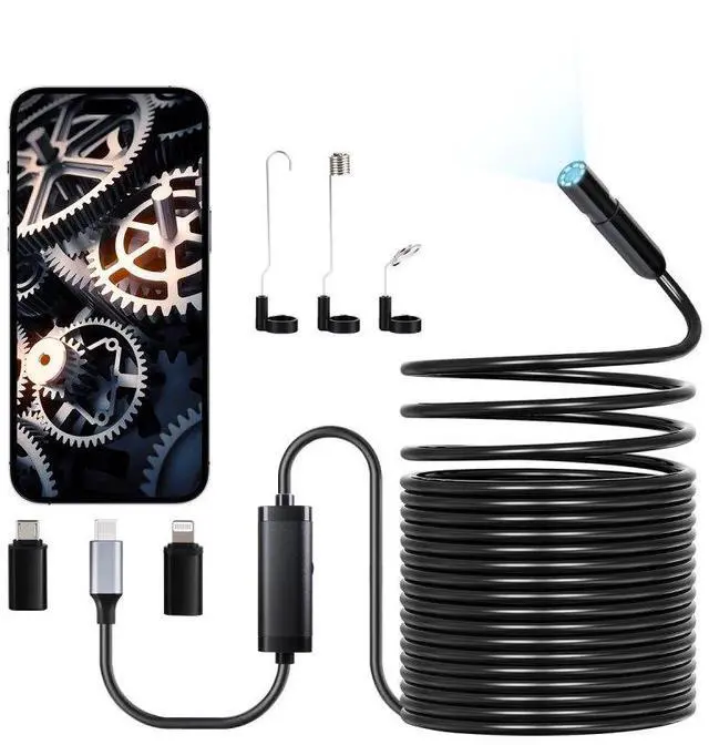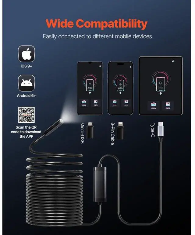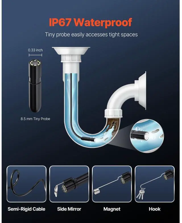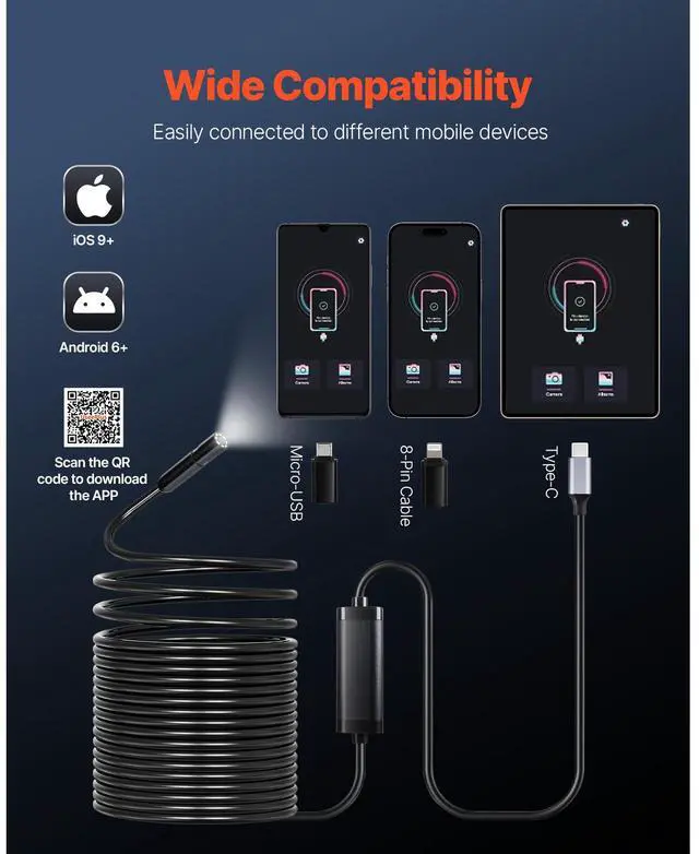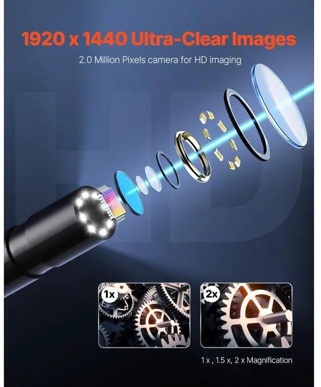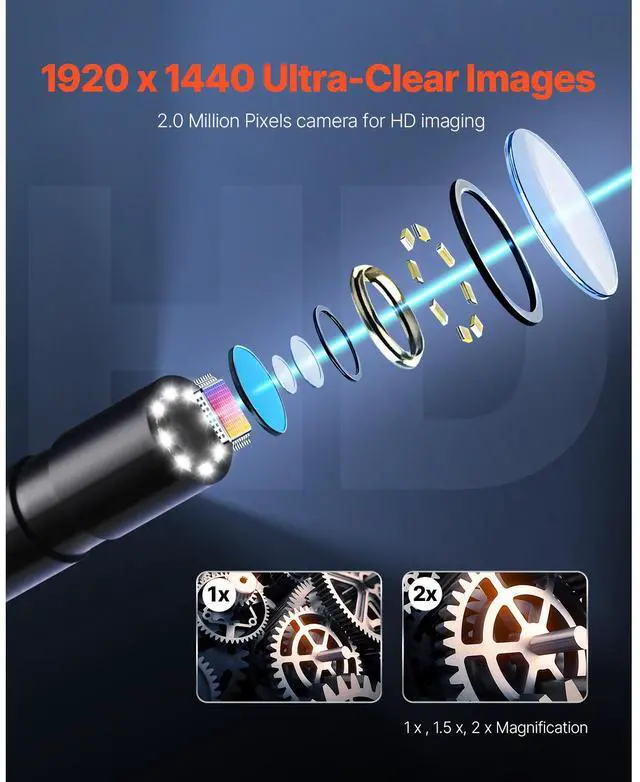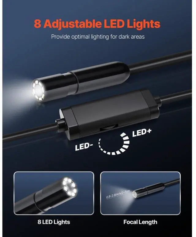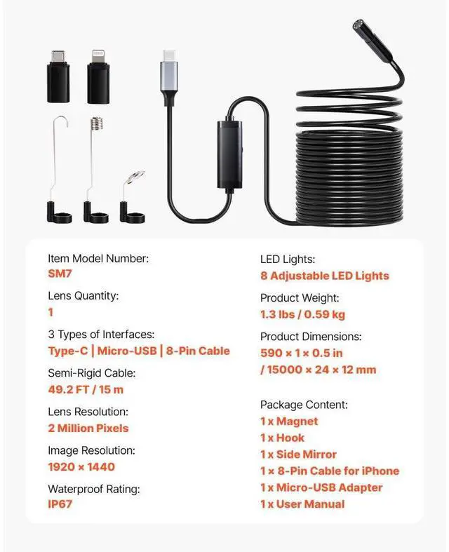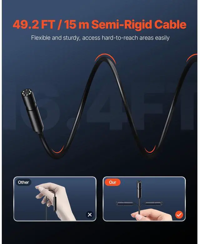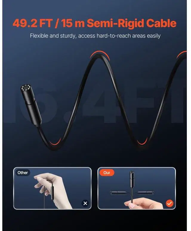 VEVOR Endoscope Camera 1920P HD Borescope for Android & IOS with 49.2FT Cable Clear Display Semi-rigid & Flexible Cable Wide Compatibility Adjustable Lights Optimal Focal Distance Wide