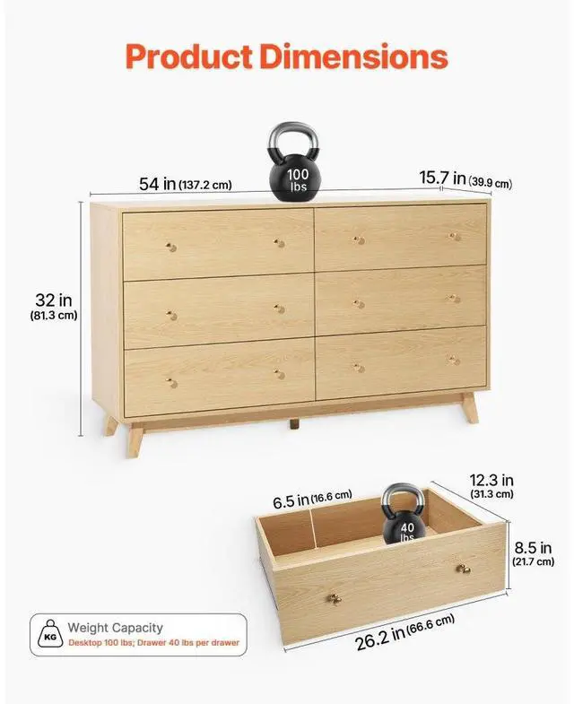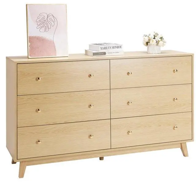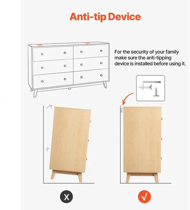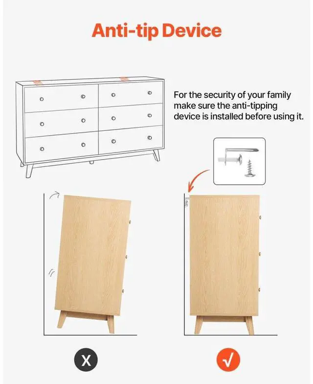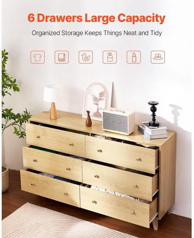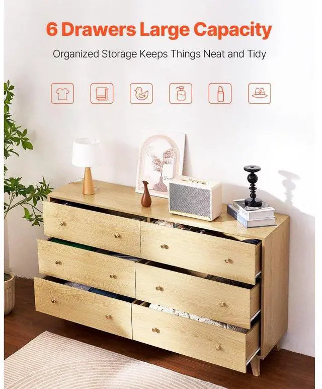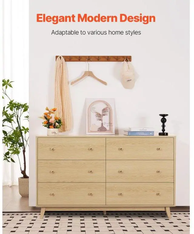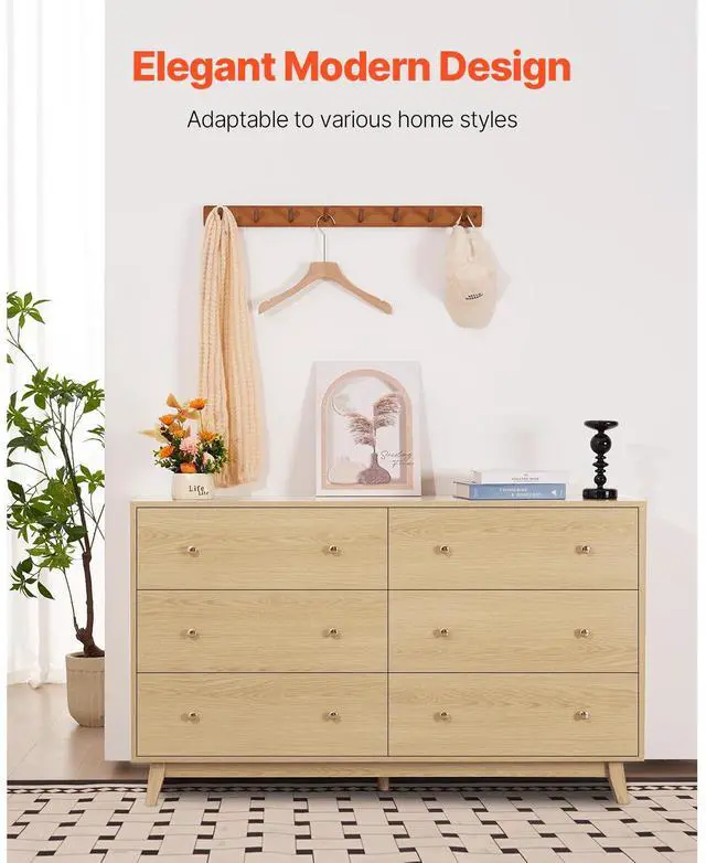 VEVOR 6 Drawer Dresser, Wooden Chest of Drawers with Sliding with Anti-tip Device, Modern Minimalist Dresser Chest, Closet Storage Organizer for Living Room, Hallway, Bedroom, Entryway, Light Wood Multi-Functional Drawer Dresser Large Storage Capacity Spacious Top Surface Smooth Sliding Versatile Use in Multiple Spaces User-Friendly Design