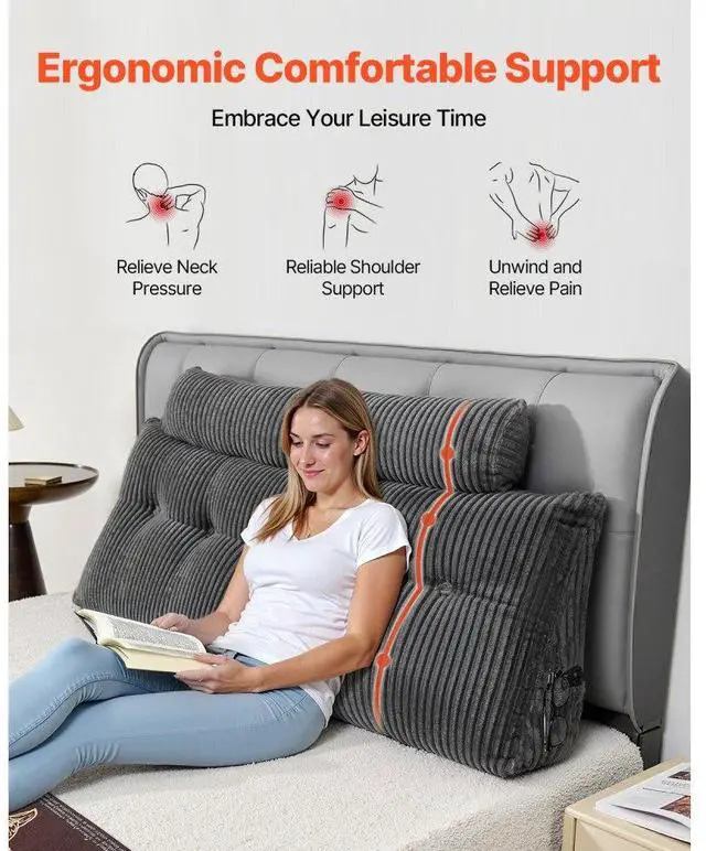 VEVOR Headboard Pillow, Queen Size Wedge Headboard Pillow with 2 Side Pockets and 2 Headrests, Bed Wedge Pillow with Washable Flannel Cloth, for Reading, Gaming, Resting, Working in Bed, Grey Skin-Friendly Ultra-Soft Velvet Fabric Organized Living at Your Fingertips Versatile Head Pillows Ergonomic Perfection Vacuum-Sealed Convenience Ideal Present Item Size: 59 in x 8 x 21 in / 1510 x 205 x 530 mm, Color: Grey, Item