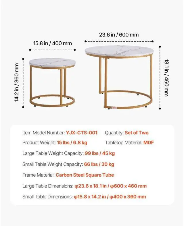 VEVOR Nesting Coffee Table Set of 2, 23.6 in Round Coffee Table, Nesting Tables for Small Place, Vintage End Side Tables Night Stand with Metal Frame, for Living Room, Bedroom, Office (White & Gold) 2-Piece Table Set Vintage and Elegant Style Flexible Use Wide Applicability Easy Assembly Stable Structure Item