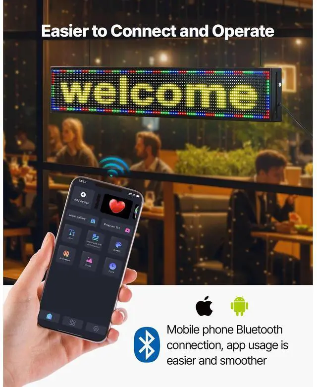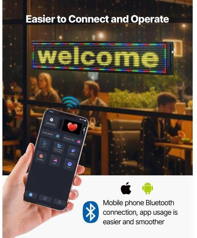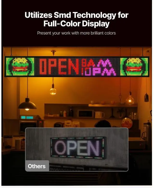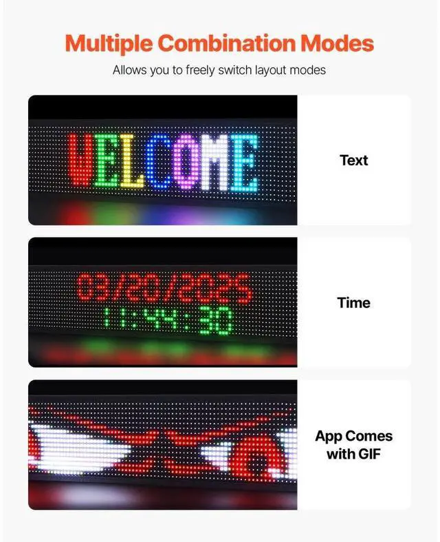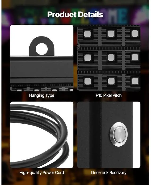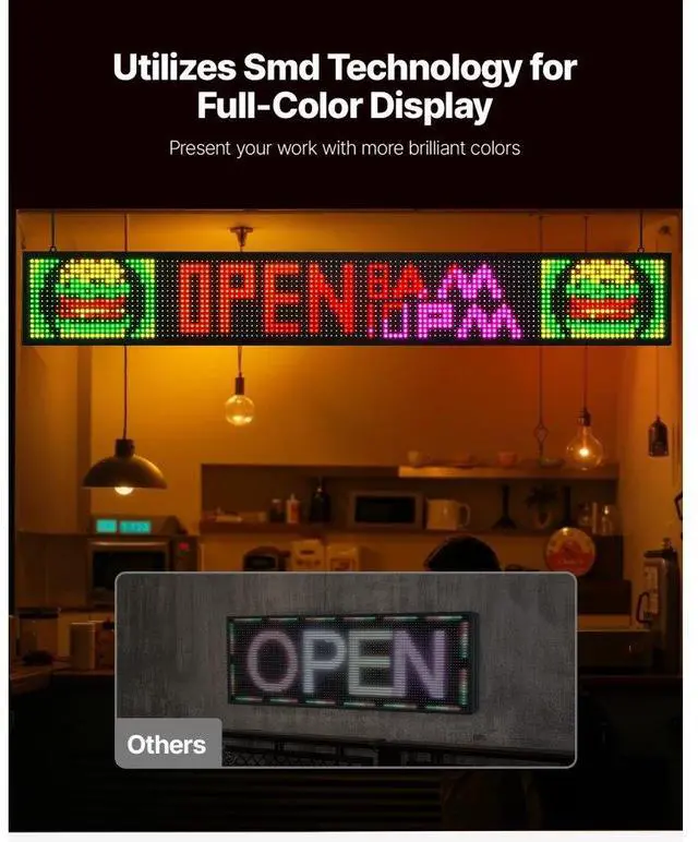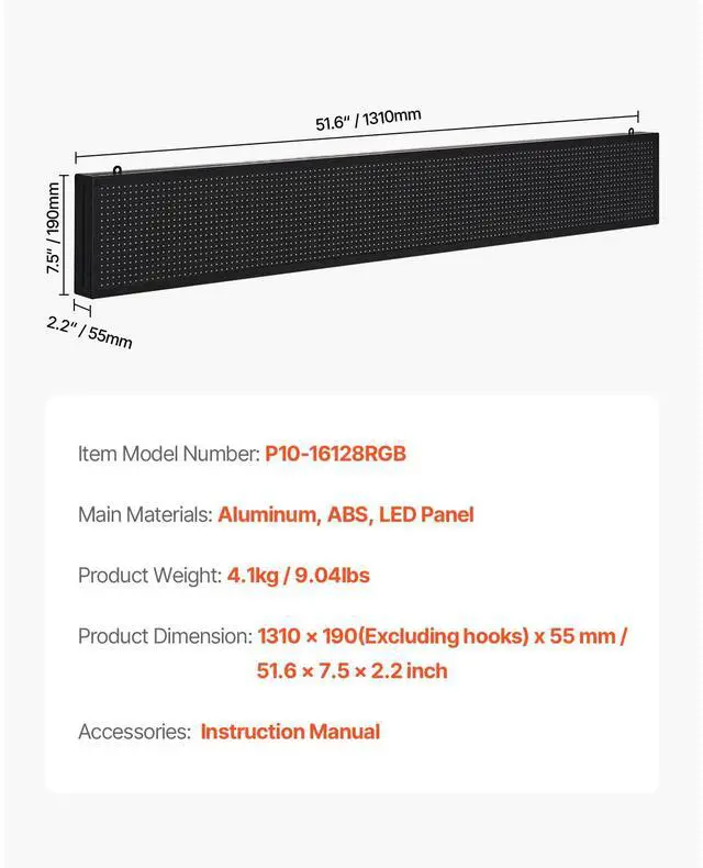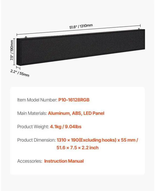 52x8 in Programmable LED Sign Digital Scrolling Display Board P10 Full-color High Brightness Easy to Operate Rich Display Modes High-quality Material Wide Application Convenient Installation Main Materials: Aluminum, ABS, LED Panel, Item