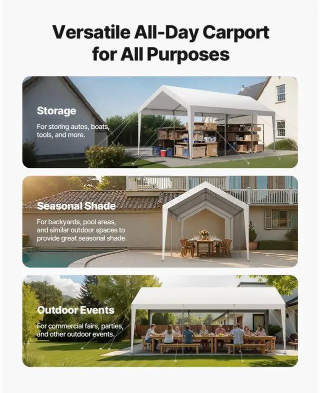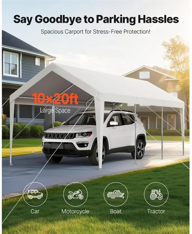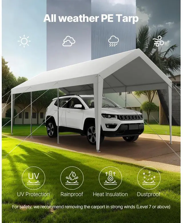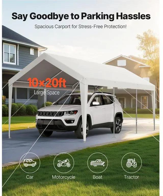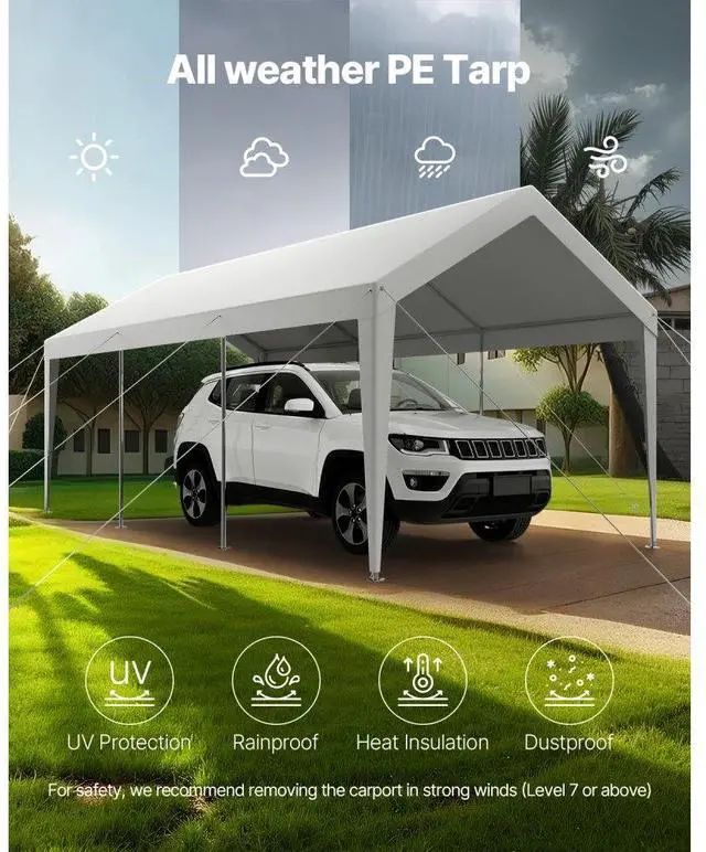 Carport Car Canopy 10 x 20 FT Heavy Duty Portable Car Garage Shelter Tent White All-Weather Protection Double-Coated PE Tarp Quick and Easy Setup Versatile Space Attention to Detail Summer Ventilation