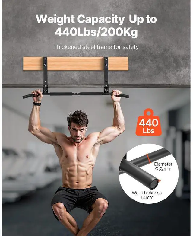 • Constructed from premium heavy-duty steel with advanced powder coating, this ceiling mounted chin up bar for home gym supports up to 440 lbs capacity, ensuring long-term durability and user safety.