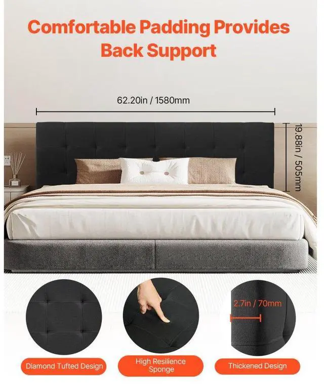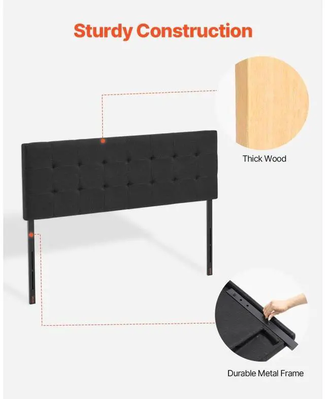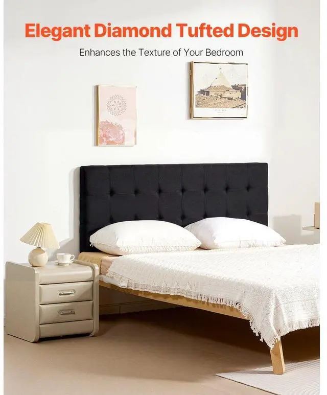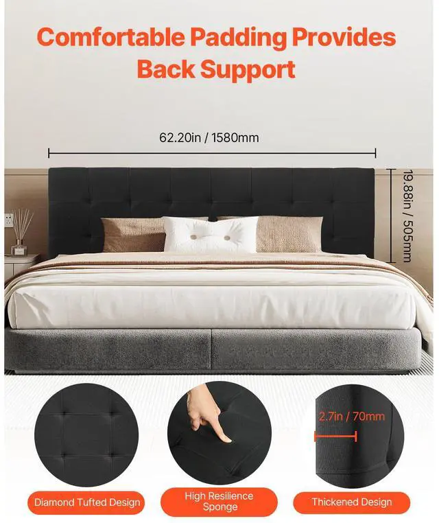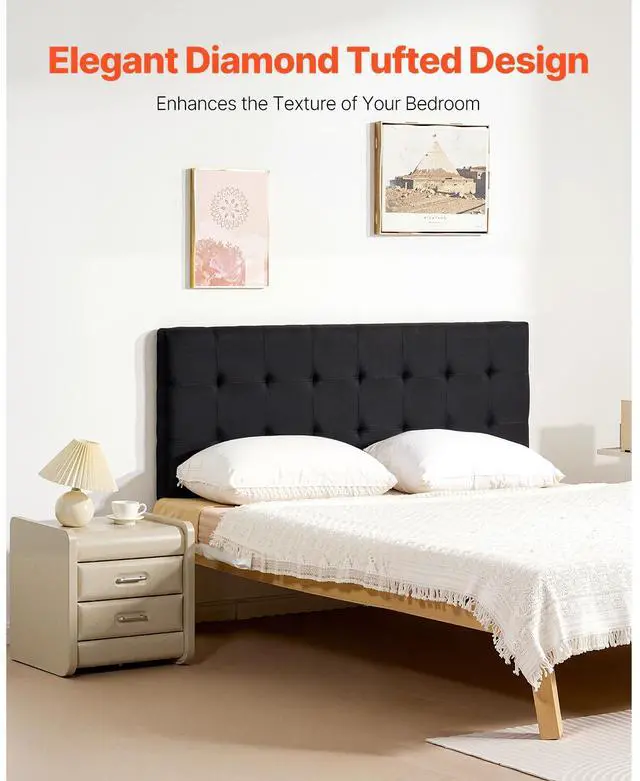 VEVOR Headboard, Queen Size Headboard with Adjustable Height, Comfortable Diamond Tufted for Queen Size Bed, W 62.2 x H( 42.72 - 54.53 ) x D 2.76 in, Ideal for Bedroom, Hotel, Homestay, Dormitory, Black Elegant Design Memory Foam Backrest Flexible Adjustment Sturdy and Durable Structure Easy Assembly Experience Easy to Clean