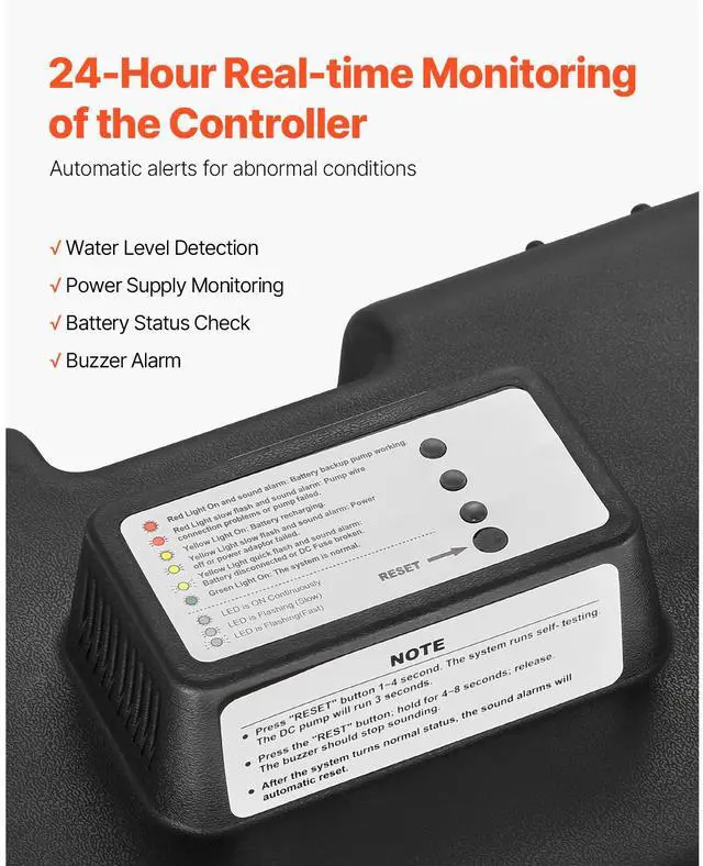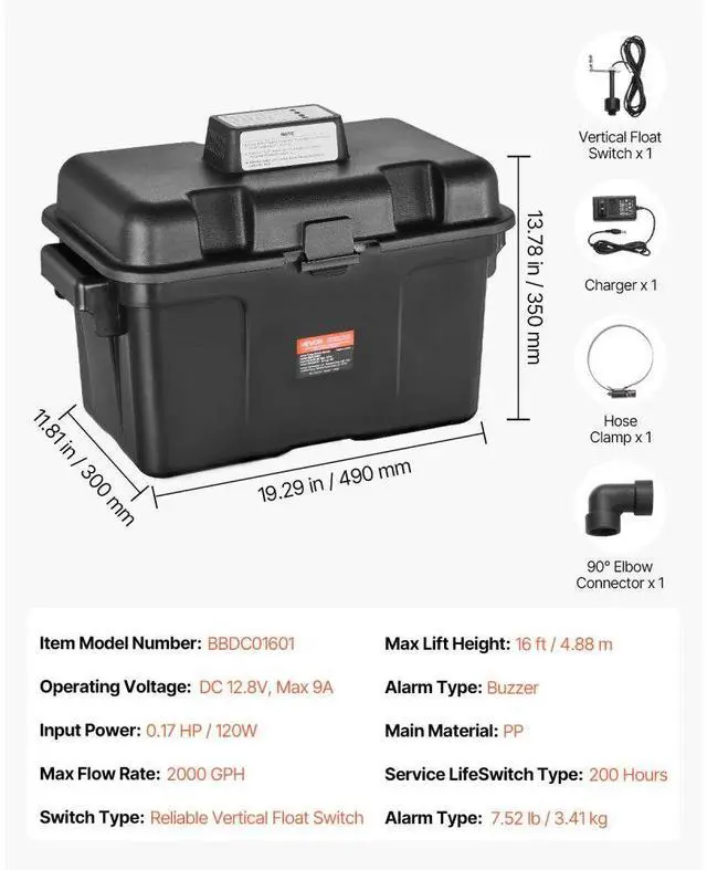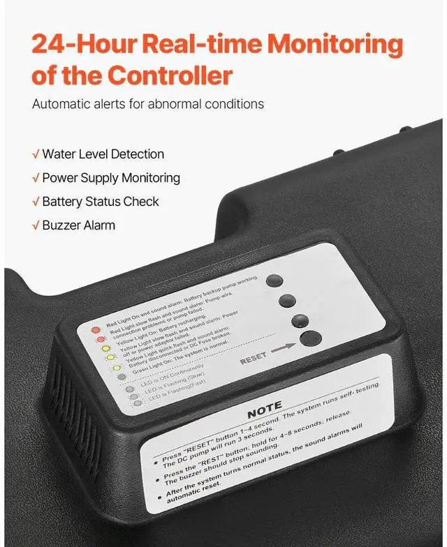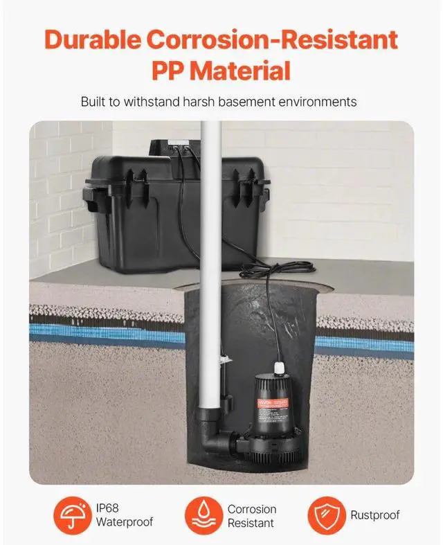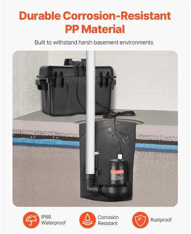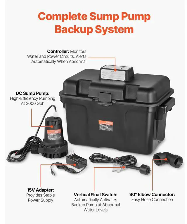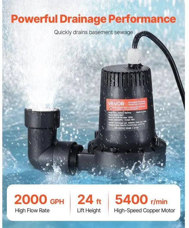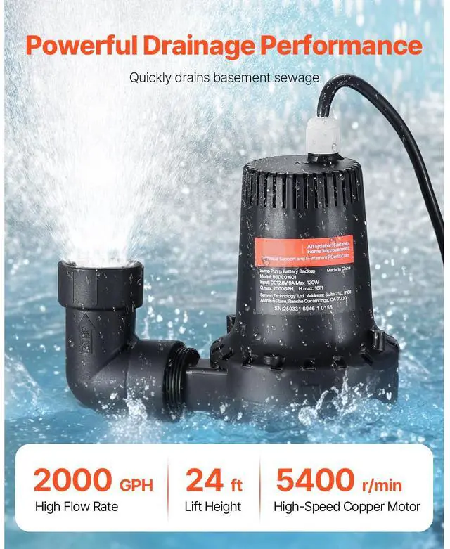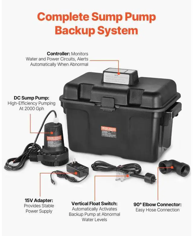 Basement Emergency Back-Up Sump Pump Backup Sump Pump System 2000GPH 0.17 HP Secure & Efficient Automatic Start & Stop IP68 Waterproof Design Thoughtful Design Versatile Application Loud