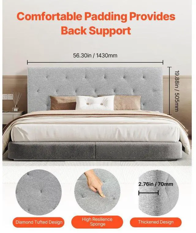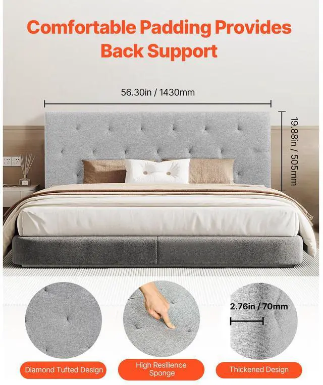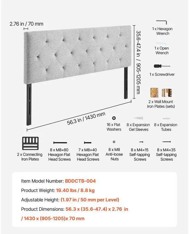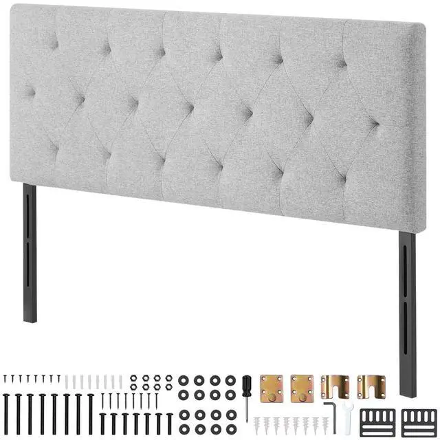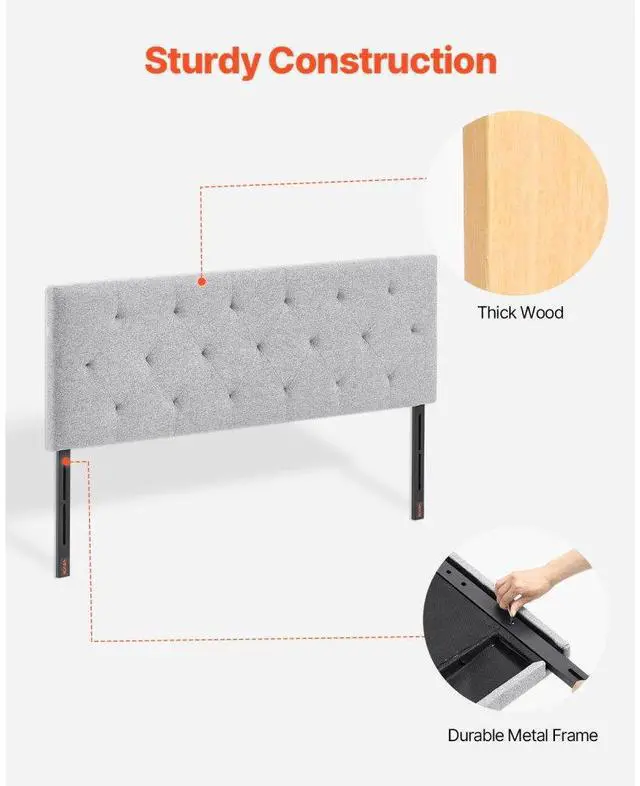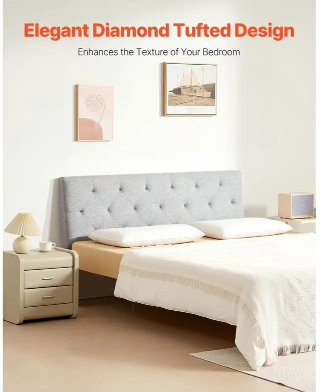 VEVOR Headboard, Full Size Headboard with Adjustable Height, Comfortable Diamond Tufted for Full Size Bed, W 56.3 x H 35.6 - 47.4 inches, Ideal for Bedroom, Hotel, Homestay, Dormitory, Light Grey Elegant Design Memory Foam Backrest Flexible Adjustment Sturdy and Durable Structure Easy Assembly Experience Easy to Clean