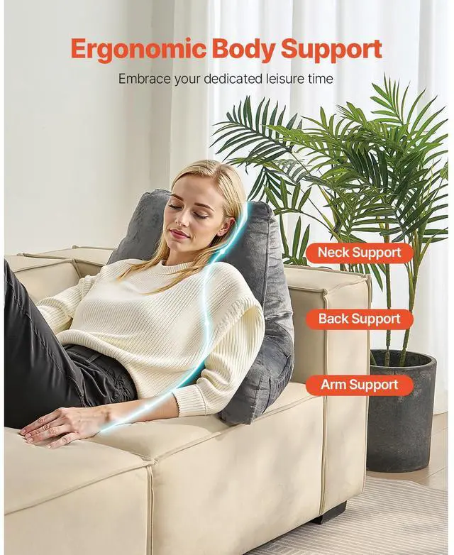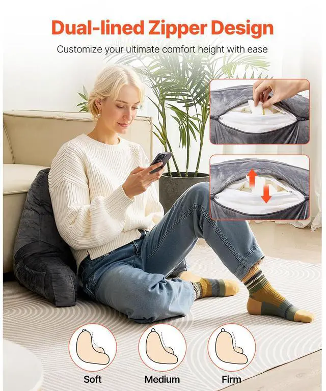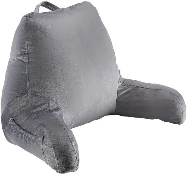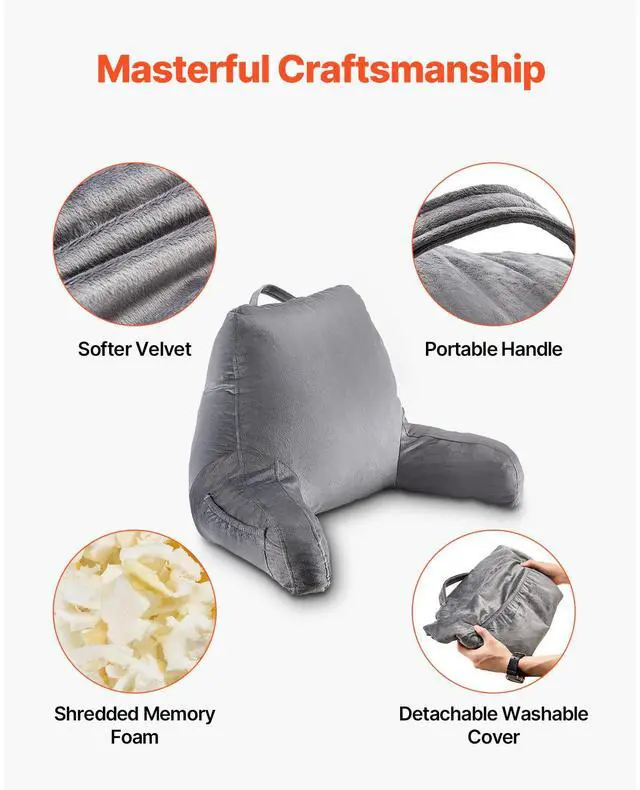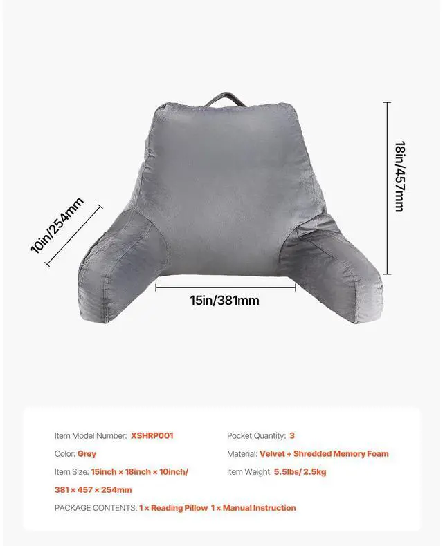 VEVOR Reading Pillow, Standard Size Bed Pillow with Shredded Memory Foam, Back Pillow with 3 Pockets and Washable Short Velvet Cloth, Top with Handle, for Watching TV, Reading, Gaming, Resting, Grey